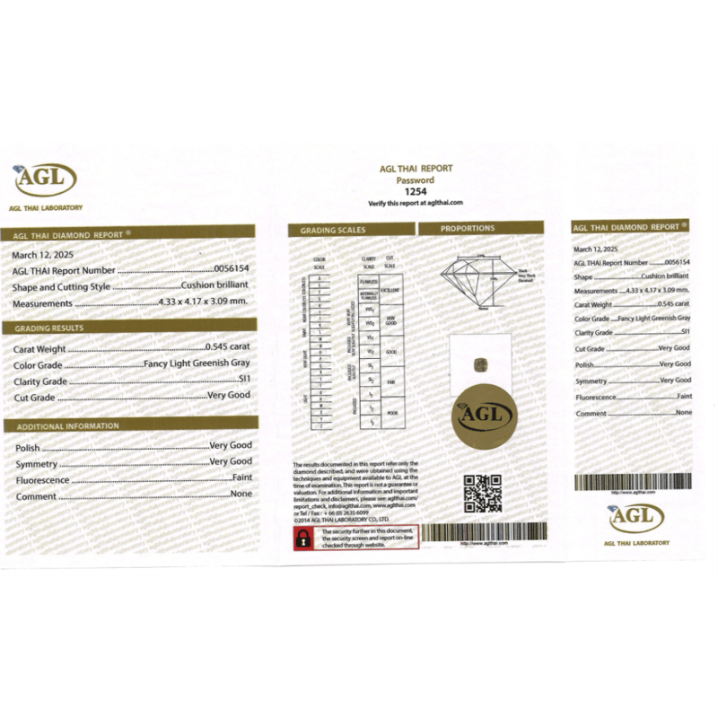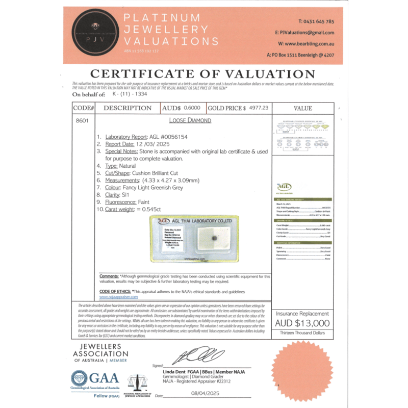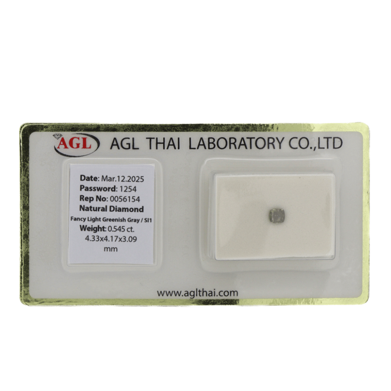 0.545CT CERTIFIED, NATURAL FANCY GREEN/GREY DIAMOND, CUSHION BRILLIANT CUT, FANCY LIGHT GREENISH-GREY COLOUR, SI1 CLARITY, LOOSE, UNSET. STONE COMES SEALED WITH AGL REPORT: 0056154. Valuations Provided by an Independent Third-Party Professional Not Directly Associated With Lloyds Auctions at AUD $13000This valuation has been conducted by an independent third-party professional. The valuation amount is an assessment by the issuing valuer and does not reflect the auction value of the item. Any inquiries regarding the valuation should be directed to the issuing valuer (refer to contact details on the certificate), as Lloyds Auctions has no affiliation or influence over the valuation, the valuer, or the stated amount. Condition: Good - Refer Images 0645872+2154