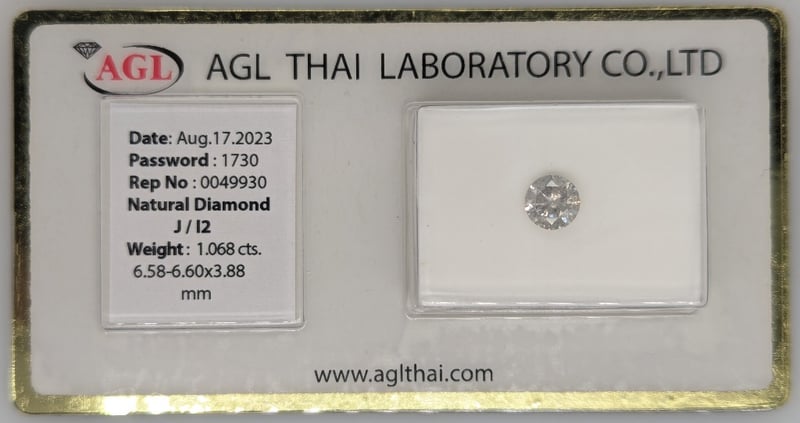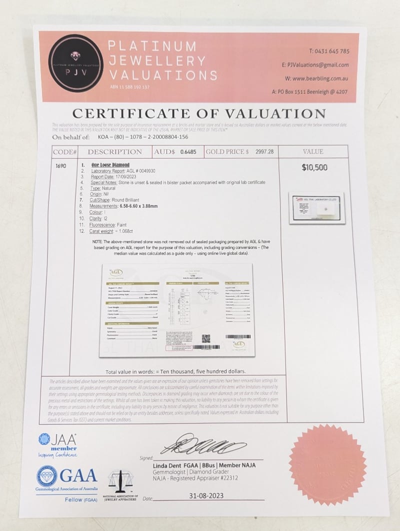 1.068CT NATURAL DIAMONDRound Brilliant Cut, J Colour, I2 Clarity, Loose, Unset. Stone Comes Sealed With Agl Report: 0049930This valuation has been conducted by an independent third-party professional. The valuation amount is an assessment by the issuing valuer and does not reflect the auction value of the item.Any inquiries regarding the valuation should be directed to the issuing valuer (refer to contact details on the certificate), as Lloyds Auctions has no affiliation or influence over the valuation, the valuer, or the stated amount.Insurance Replacement Valuation Amount: $10,500.00584964+1
