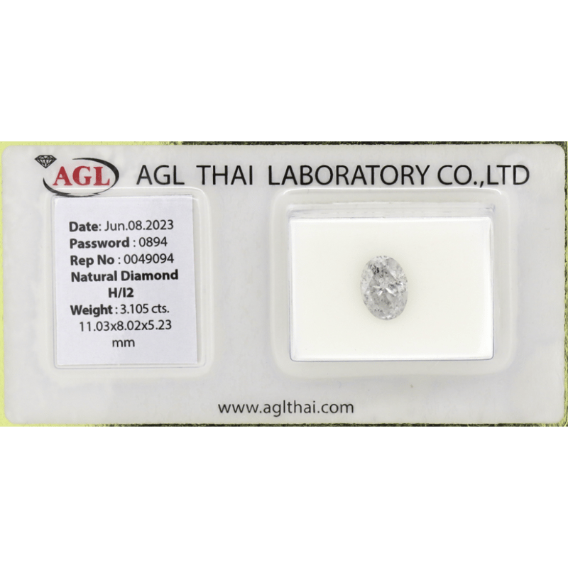 3.105CT CERTIFIED, NATURAL DIAMOND, OVAL BRILLIANT CUT, H COLOUR, P2 CLARITY, LOOSE, UNSET. STONE COMES SEALED WITH AGL REPORT: 0049094. Valuations Provided by an Independent Third-Party Professional Not Directly Associated With Lloyds Auctions at AUD $$41,800.00This valuation has been conducted by an independent third-party professional. The valuation amount is an assessment by the issuing valuer and does not reflect the auction value of the item. Any inquiries regarding the valuation should be directed to the issuing valuer (refer to contact details on the certificate), as Lloyds Auctions has no affiliation or influence over the valuation, the valuer, or the stated amount. Condition: Good - Refer Images 0645879+2201