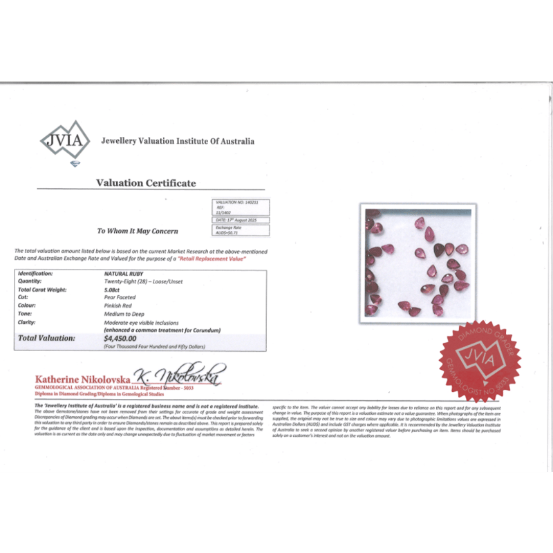5.08CT TSW X 28, NATURAL CORUNDUM RUBIES, PEAR FACETED CUT, MEDIUM-DEEP PINKISH-RED, MODERATE EYE VISIBLE INCLUSIONS, ENHANCED, LOOSE, UNSET. Valuations Provided by an Independent Third-Party Professional Not Directly Associated With Lloyds Auctions at AUD $$4,450.00This valuation has been conducted by an independent third-party professional. The valuation amount is an assessment by the issuing valuer and does not reflect the auction value of the item. Any inquiries regarding the valuation should be directed to the issuing valuer (refer to contact details on the certificate), as Lloyds Auctions has no affiliation or influence over the valuation, the valuer, or the stated amount. Condition: Good - Refer Images 0645879+2276