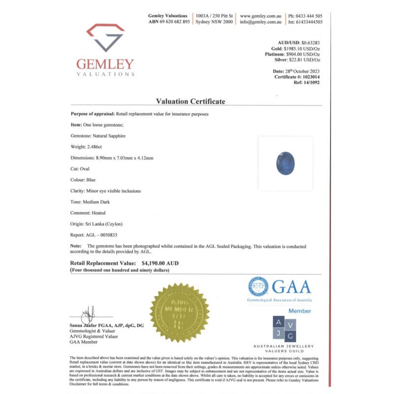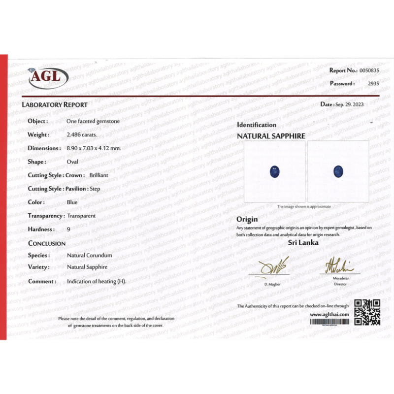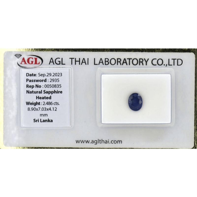 2.486CT CERTIFIED, NATURAL BLUE CEYLON SAPPHIRE, OVAL CUT, MEDIUM DARK BLUE, MINOR EYE VISIBLE INCLUSIONS, INDICATION OF HEAT TREATMENT, CEYLON (SRI LANKA) ORIGIN, LOOSE, UNSET. STONE COMES SEALED WITH AGL REPORT: 0050835.