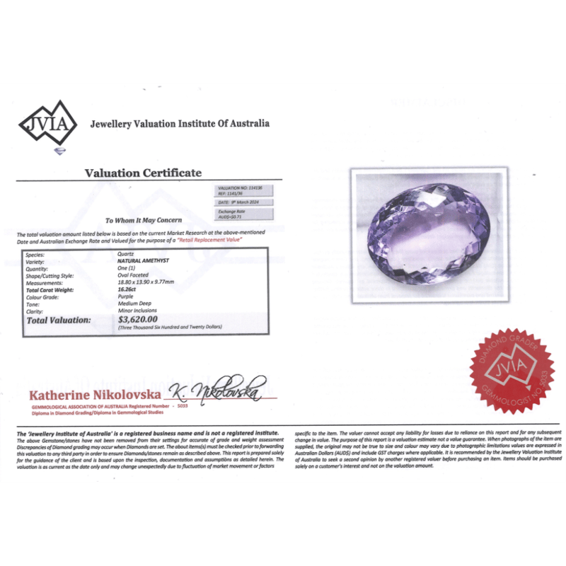 16.26CT NATURAL AMETHYST, OVAL FACETED CUT, MEDIUM DEEP PURPLE, MINOR INCLUSIONS, LOOSE, UNSET. Valuations Provided by an Independent Third-Party Professional Not Directly Associated With Lloyds Auctions at AUD $$3,620.00This valuation has been conducted by an independent third-party professional. The valuation amount is an assessment by the issuing valuer and does not reflect the auction value of the item. Any inquiries regarding the valuation should be directed to the issuing valuer (refer to contact details on the certificate), as Lloyds Auctions has no affiliation or influence over the valuation, the valuer, or the stated amount. Condition: Good - Refer Images 0645879+2261