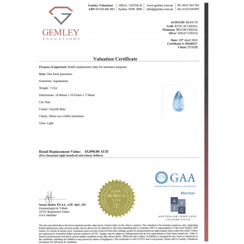 7.22CT NATURAL AQUAMARINE, PEAR CUT, LIGHT GREYISH-BLUE, MINOR EYE VISIBLE INCLUSIONS, LOOSE, UNSET. Valuations Provided by an Independent Third-Party Professional Not Directly Associated With Lloyds Auctions at AUD $$5,890.00This valuation has been conducted by an independent third-party professional. The valuation amount is an assessment by the issuing valuer and does not reflect the auction value of the item. Any inquiries regarding the valuation should be directed to the issuing valuer (refer to contact details on the certificate), as Lloyds Auctions has no affiliation or influence over the valuation, the valuer, or the stated amount. Condition: Good - Refer Images 0645879+2221