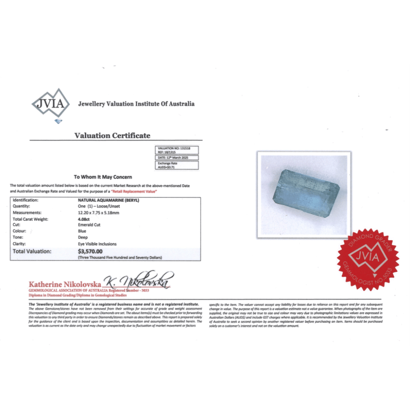 4.08CT, NATURAL BERYL AQUAMARINE, EMERALD CUT, DEEP BLUE, EYE VISIBLE INCLUSIONS, LOOSE, UNSET. Valuations Provided by an Independent Third-Party Professional Not Directly Associated With Lloyds Auctions at AUD $$3,570.00This valuation has been conducted by an independent third-party professional. The valuation amount is an assessment by the issuing valuer and does not reflect the auction value of the item. Any inquiries regarding the valuation should be directed to the issuing valuer (refer to contact details on the certificate), as Lloyds Auctions has no affiliation or influence over the valuation, the valuer, or the stated amount. Condition: Good - Refer Images 0645879+2270