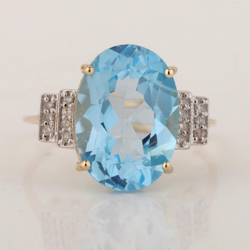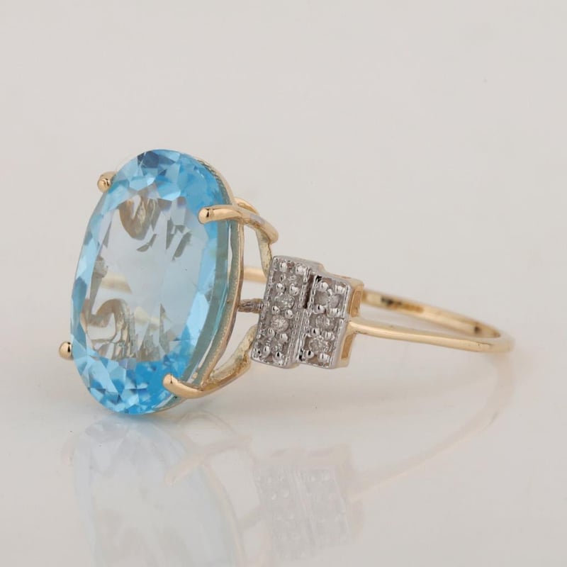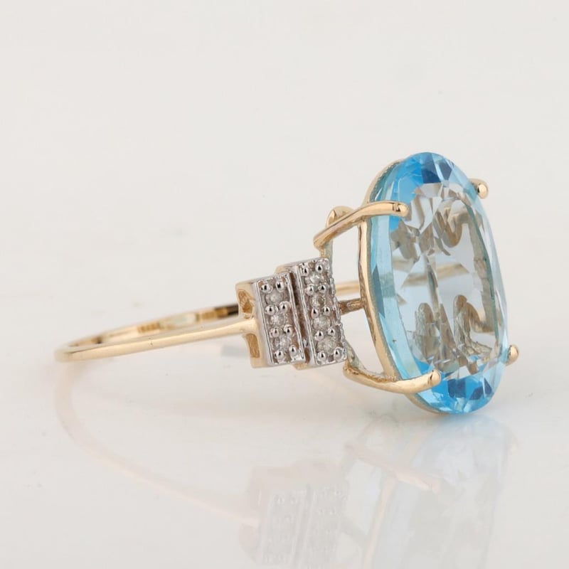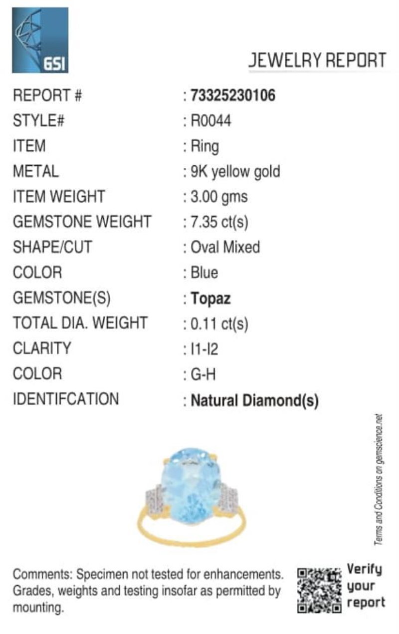9CT YELLOW GOLD NATURAL SWISS BLUE TOPAZ & DIAMOND RING Weight Of The Item: 3 GFineness Of Metal(S): Yellow Gold 9KtThe Ring Consists Of (1) Oval Brilliant Natural Swiss Blue Topaz. Surrounding The Main Stones Are Round Brilliant Cut Natural Diamonds.Antique StyleIdentification: Natural Swiss Blue TopazColor: BlueShape: Oval Brilliant CutNo. Of Stone: 1Dimension: 14 Mm X 10 Mm X 8.4 MmWeight: 7.35 CaratsCut: Very GoodIdentification: Natural DiamondShape: Round Brilliant CutWeight: 0.11 CtsCut: Excellent. Certificates Are Provided By Gemological Science International (Gsi), An Independent Third-Party Gemological Laboratory Based In The Usa And Recognised Among The Top 10 Gem Labs Globally Markings: 9ct Condition: Good - Refer Images 0488238+11