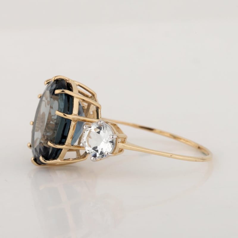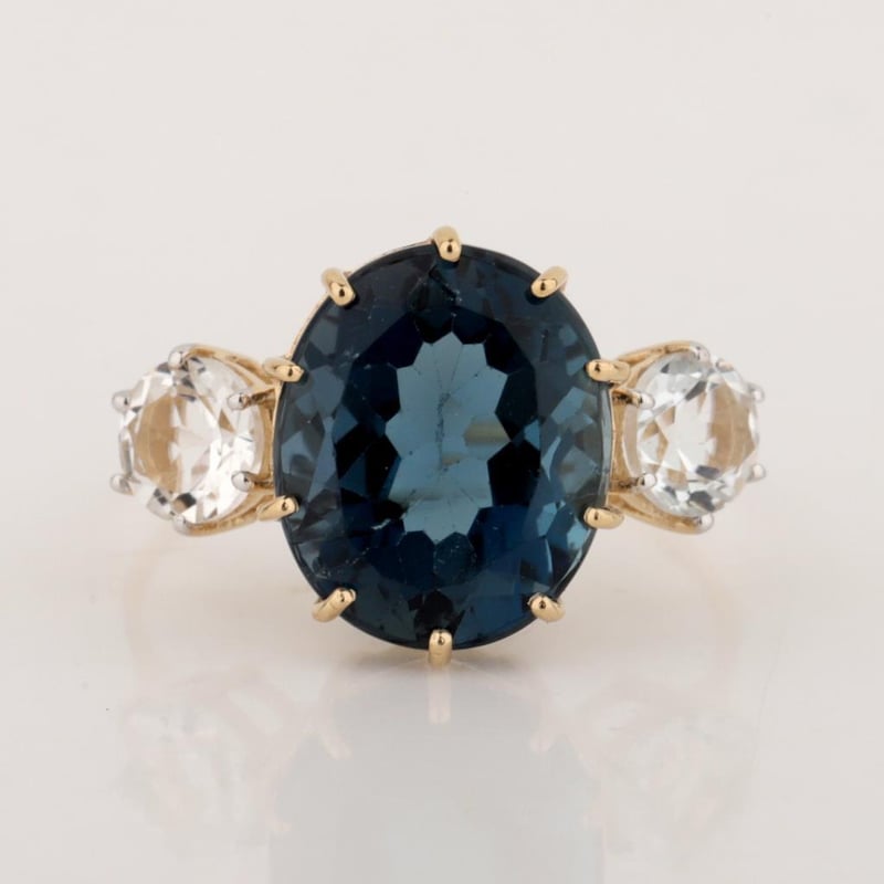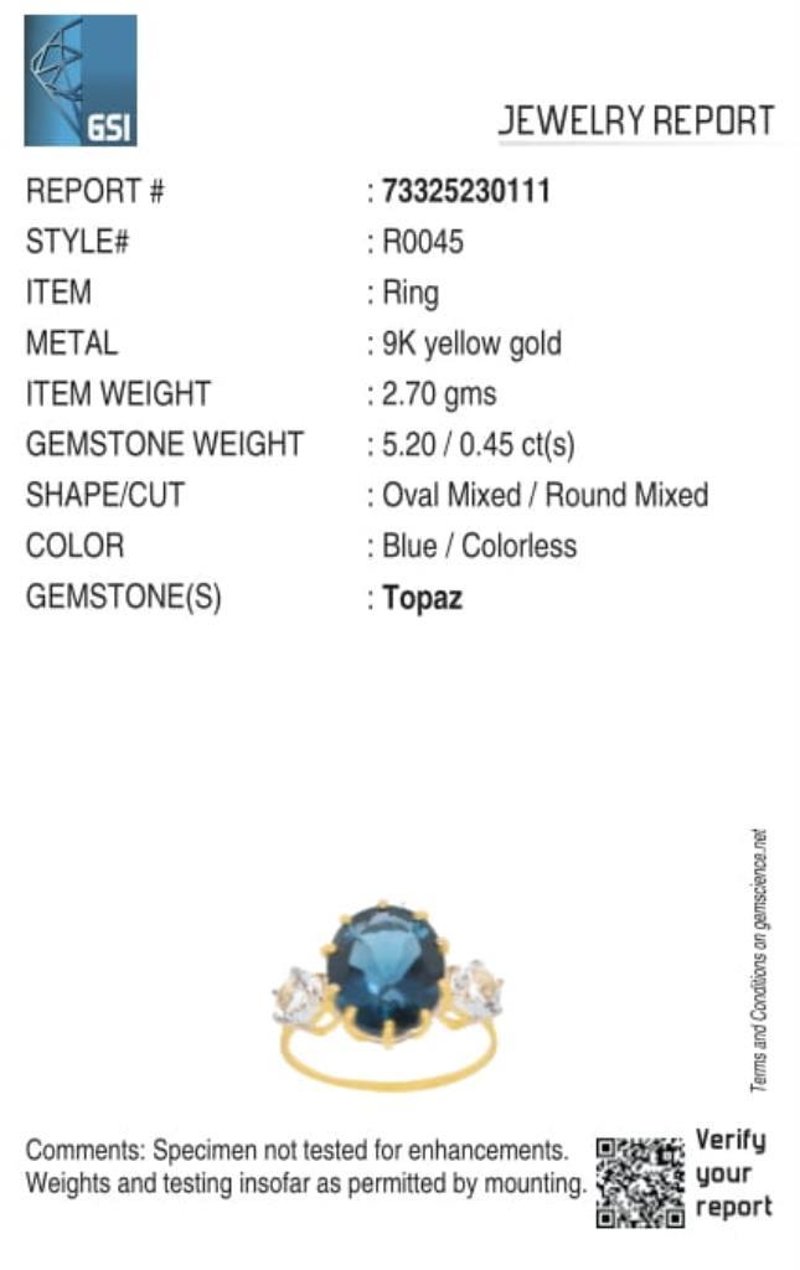 9CT YELLOW GOLD NATURAL LONDON BLUE TOPAZ / NATURAL WHITE TOPAZ RING Weight Of The Item: 2.7 GFineness Of Metal(S): Yellow Gold 9KtThe Ring Consists Of (1) Oval Brilliant Natural London Blue Topaz & (2) Round Brilliant Cut White Topaz.Antique StyleIdentification: Natural London Blue Topaz / Natural White TopazColor: Blue / WhiteShape: Oval Brilliant Cut / Round Faceted CutNo. Of Stone: 3Dimension: 12 Mm X 10 Mm X 7.2 MmWeight: 5.2 Carats / 0.45 CaratsCut: Very Good. Certificates Are Provided By Gemological Science International (Gsi), An Independent Third-Party Gemological Laboratory Based In The Usa And Recognised Among The Top 10 Gem Labs Globally Markings: 9ct Condition: Good - Refer Images 0488238+17