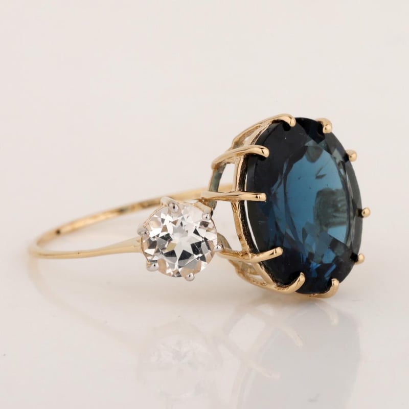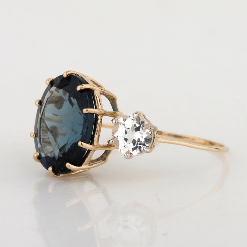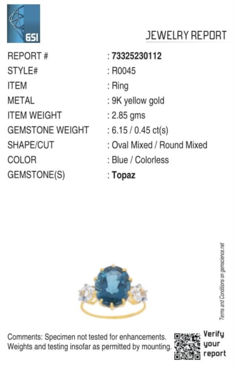 9CT YELLOW GOLD NATURAL LONDON BLUE TOPAZ / NATURAL WHITE TOPAZ RING Weight Of The Item: 2.85 GFineness Of Metal(S): Yellow Gold 9KtThe Ring Consists Of (1) Oval Brilliant Natural London Blue Topaz & (2) Round Brilliant Cut White Topaz.Antique StyleIdentification: Natural London Blue Topaz / Natural White TopazColor: Blue / WhiteShape: Oval Brilliant Cut / Round Faceted CutNo. Of Stone: 3Dimension: 12 Mm X 10 Mm X 7.2 MmWeight: 6.15 Carats / 0.45 CaratsCut: Very Good. Certificates Are Provided By Gemological Science International (Gsi), An Independent Third-Party Gemological Laboratory Based In The Usa And Recognised Among The Top 10 Gem Labs Globally Markings: 9ct Condition: Good - Refer Images 0488238+19