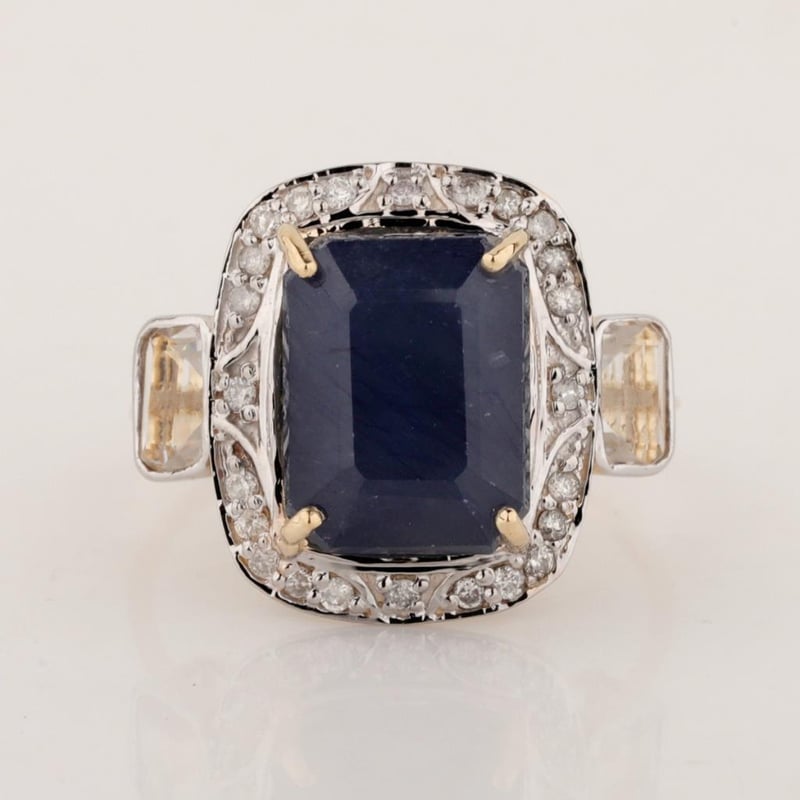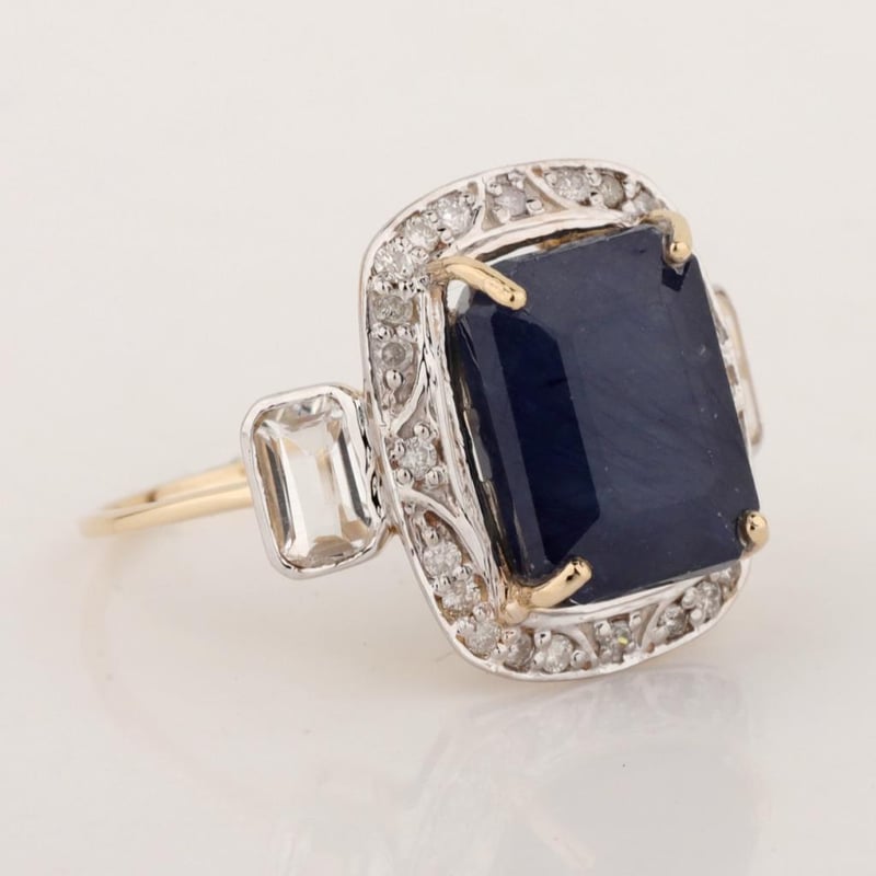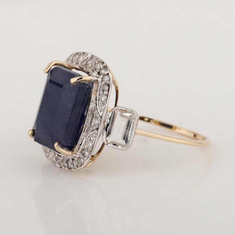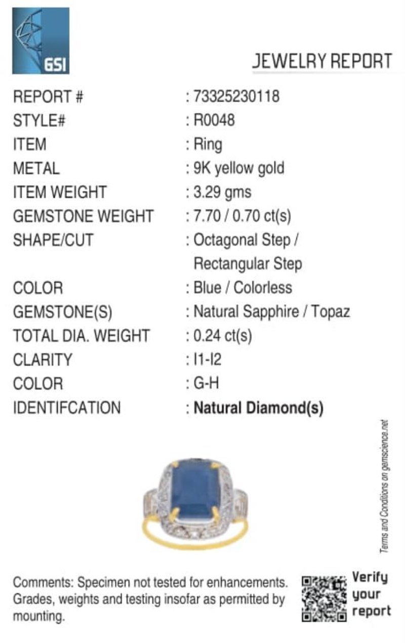 9CT YELLOW GOLD NATURAL BLUE SAPPHIRE / NATURAL WHITE TOPAZ & DIAMOND RING Weight Of The Item: 3.29 GFineness Of Metal(S): Yellow Gold 9KtThe Ring Consists Of (1) Cushion Brilliant Natural Blue Sapphire & (2) Round Brilliant Cut White Topaz. Surrounding The Main Stones Are Round Brilliant Cut Natural Diamonds.Antique StyleIdentification: Natural Blue Sapphire / Natural White TopazColor: Blue / WhiteShape: Cushion Brilliant Cut / Octagon Faceted CutNo. Of Stone: 3Dimension: 14 Mm X 10 Mm X 8.4 MmWeight: 7.7 Carats / 0.7 CaratsCut: Very GoodIdentification: Natural DiamondShape: Round Brilliant CutWeight: 0.24 CtsCut: Excellent. Certificates Are Provided By Gemological Science International (Gsi), An Independent Third-Party Gemological Laboratory Based In The Usa And Recognised Among The Top 10 Gem Labs Globally Markings: 9ct Condition: Good - Refer Images 0488238+25