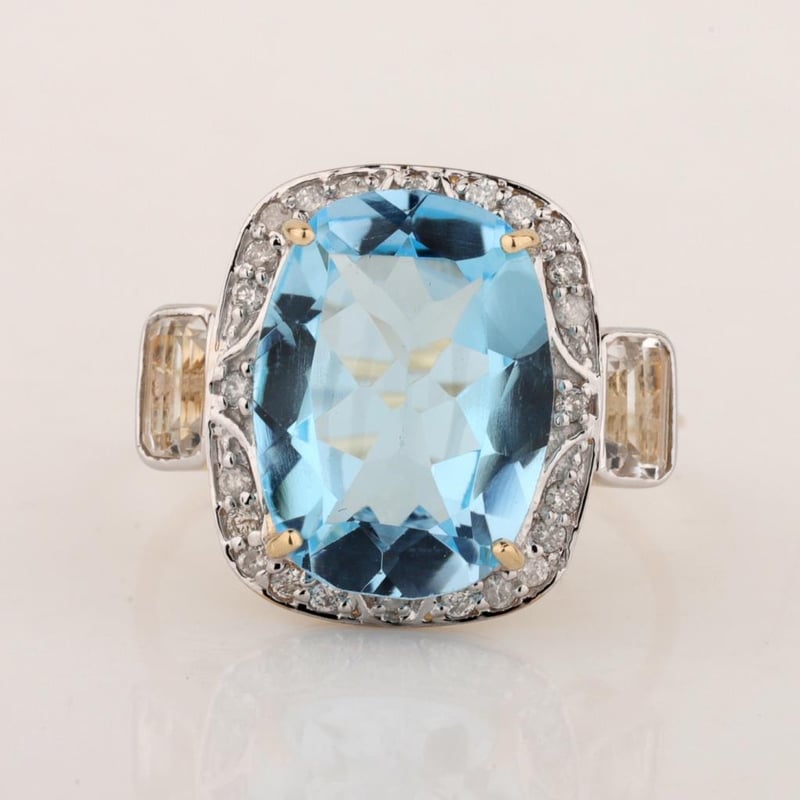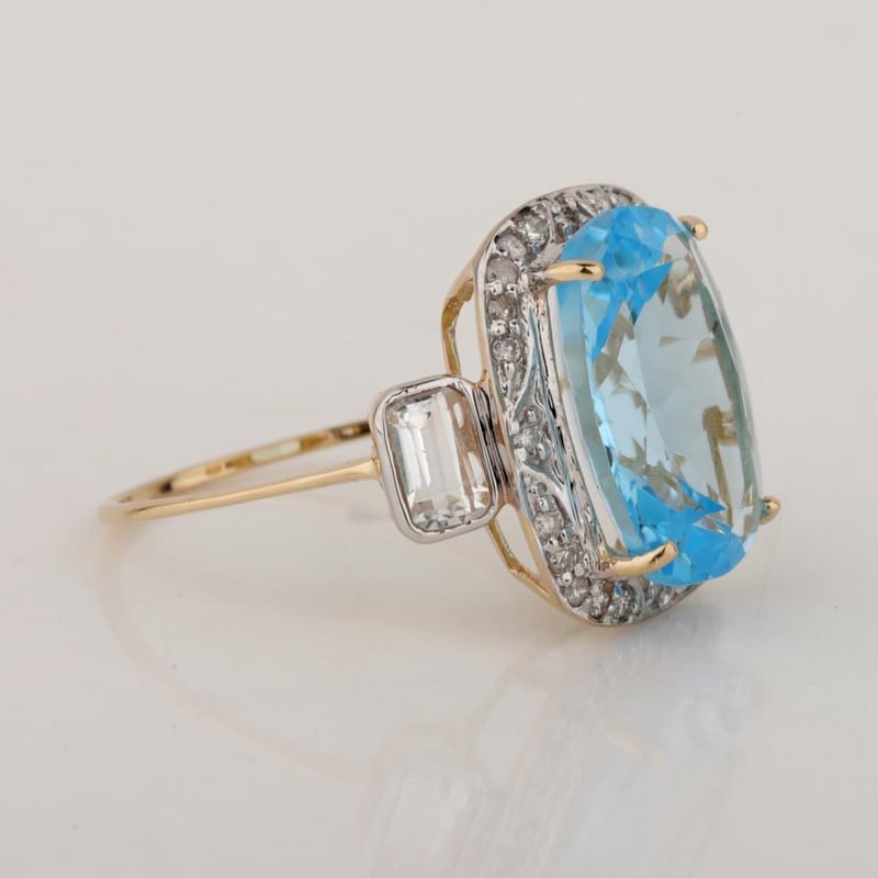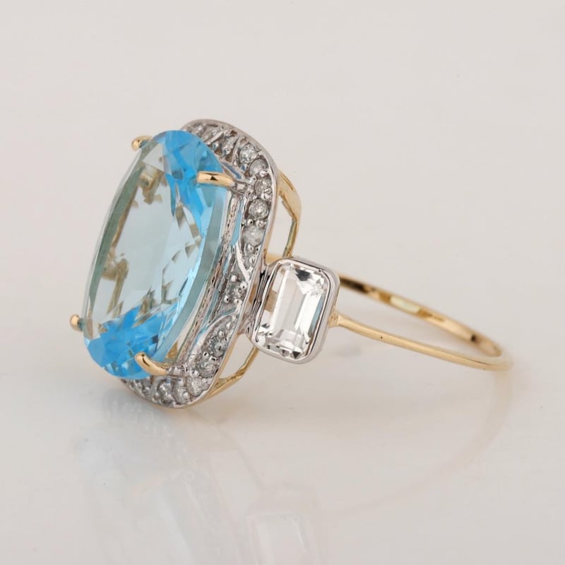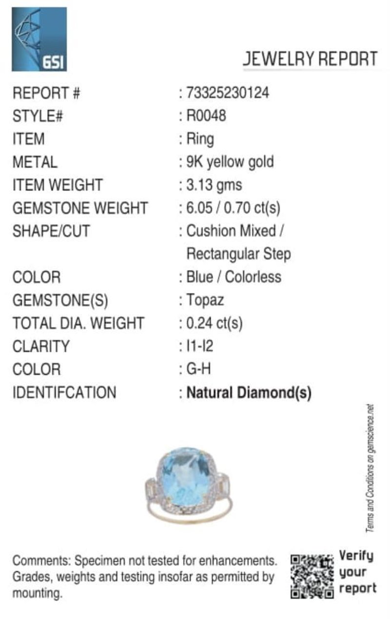 9CT YELLOW GOLD NATURAL SWISS BLUE TOPAZ / NATURAL WHITE TOPAZ & DIAMOND RING Weight Of The Item: 3.13 GFineness Of Metal(S): Yellow Gold 9KtThe Ring Consists Of (1) Cushion Brilliant Natural Swiss Blue Topaz & (2) Round Brilliant Cut White Topaz. Surrounding The Main Stones Are Round Brilliant Cut Natural Diamonds.Antique StyleIdentification: Natural Swiss Blue Topaz / Natural White TopazColor: Blue / WhiteShape: Cushion Brilliant Cut / Octagon Faceted CutNo. Of Stone: 3Dimension: 14 Mm X 10 Mm X 8.4 MmWeight: 6.05 Carats / 0.7 CaratsCut: Very GoodIdentification: Natural DiamondShape: Round Brilliant CutWeight: 0.24 CtsCut: Excellent. Certificates Are Provided By Gemological Science International (Gsi), An Independent Third-Party Gemological Laboratory Based In The Usa And Recognised Among The Top 10 Gem Labs Globally Markings: 9ct Condition: Good - Refer Images 0488238+31
