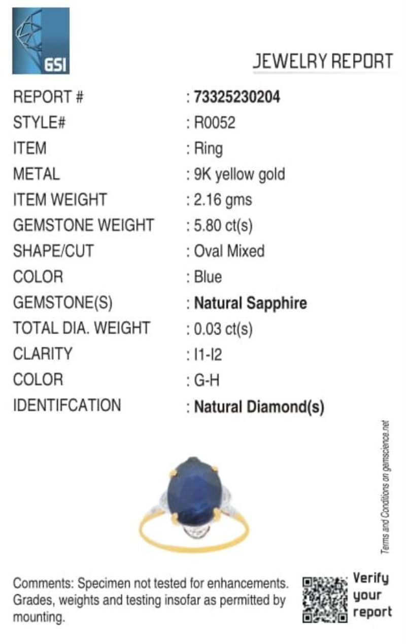 9CT YELLOW GOLD NATURAL BLUE SAPPHIRE & DIAMOND RING Weight Of The Item: 2.16 GFineness Of Metal(S): Yellow Gold 9KtThe Ring Consists Of (1) Oval Brilliant Natural Blue Sapphire. Surrounding The Main Stones Are Round Brilliant Cut Natural Diamonds.Antique StyleIdentification: Natural Blue SapphireColor: BlueShape: Oval Brilliant CutNo. Of Stone: 1Dimension: 11 Mm X 9 Mm X 6.6 MmWeight: 5.8 CaratsCut: Very GoodIdentification: Natural DiamondShape: Round Brilliant CutWeight: 0.03 CtsCut: Excellent. Certificates Are Provided By Gemological Science International (Gsi), An Independent Third-Party Gemological Laboratory Based In The Usa And Recognised Among The Top 10 Gem Labs Globally Markings: 9ct Condition: Good - Refer Images 0488238+36