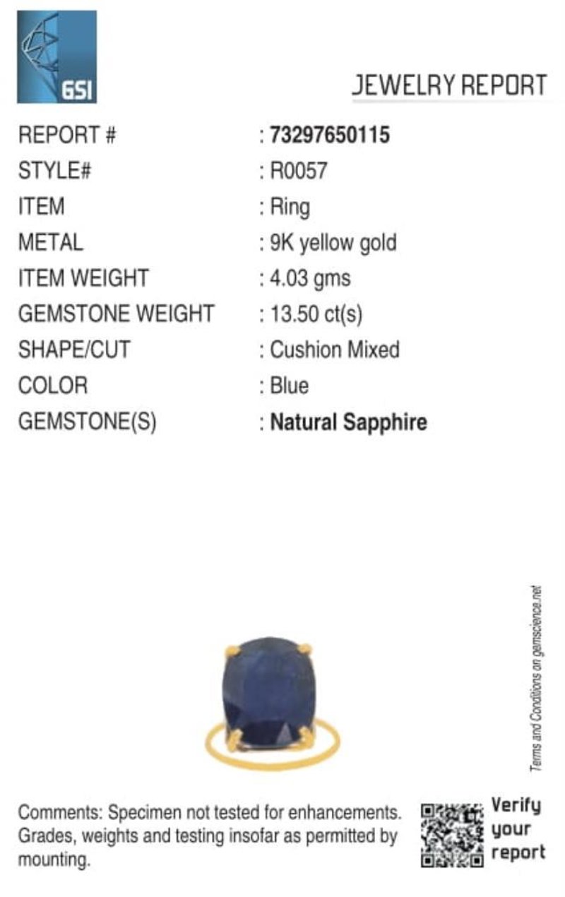 9CT YELLOW GOLD NATURAL BLUE SAPPHIRE RING Weight Of The Item: 4.03 GFineness Of Metal(S): Yellow Gold 9KtThe Ring Consists Of (1) Octagon Brilliant Natural Blue Sapphire.Antique StyleIdentification: Natural Blue SapphireColor: BlueShape: Octagon Brilliant CutNo. Of Stone: 1Dimension: 15 Mm X 12 Mm X 9 MmWeight: 13.5 CaratsCut: Very Good. Certificates Are Provided By Gemological Science International (Gsi), An Independent Third-Party Gemological Laboratory Based In The Usa And Recognised Among The Top 10 Gem Labs Globally Markings: 9ct Condition: Good - Refer Images 0488238+39