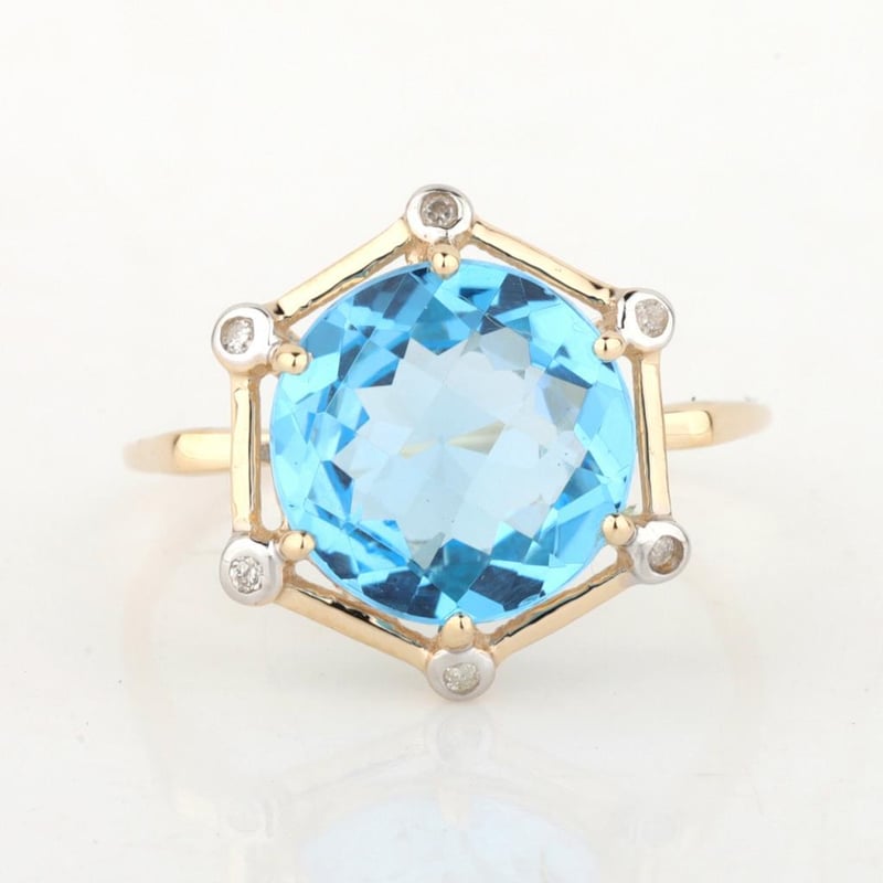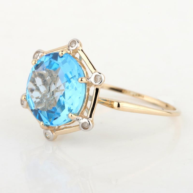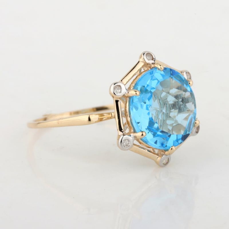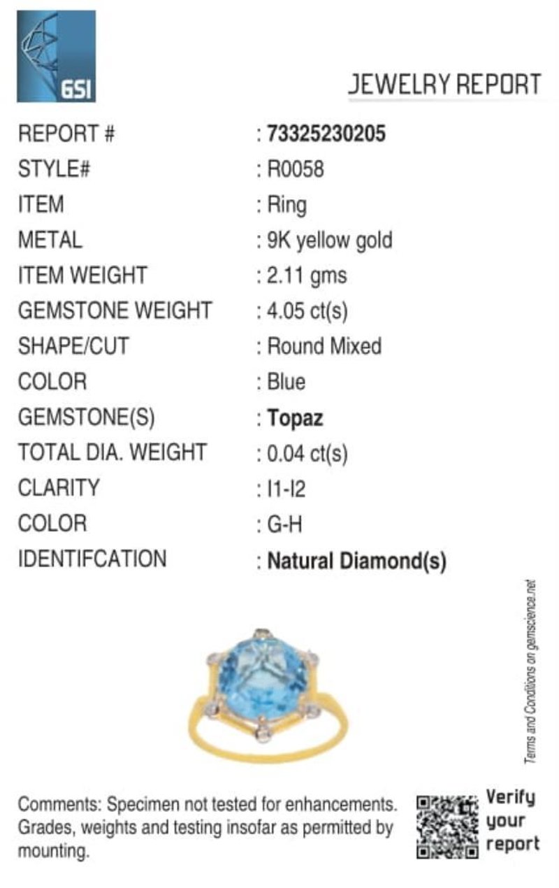 9CT YELLOW GOLD NATURAL SWISS BLUE TOPAZ & DIAMOND RING Weight Of The Item: 2.11 GFineness Of Metal(S): Yellow Gold 9KtThe Ring Consists Of (1) Round Brilliant Natural Swiss Blue Topaz. Surrounding The Main Stones Are Round Brilliant Cut Natural Diamonds.Antique StyleIdentification: Natural Swiss Blue TopazColor: BlueShape: Round Brilliant CutNo. Of Stone: 1Dimension: 10 Mm X 10 Mm X 6 MmWeight: 4.05 CaratsCut: Very GoodIdentification: Natural DiamondShape: Round Brilliant CutWeight: 0.04 CtsCut: Excellent. Certificates Are Provided By Gemological Science International (Gsi), An Independent Third-Party Gemological Laboratory Based In The Usa And Recognised Among The Top 10 Gem Labs Globally Markings: 9ct Condition: Good - Refer Images 0488238+41