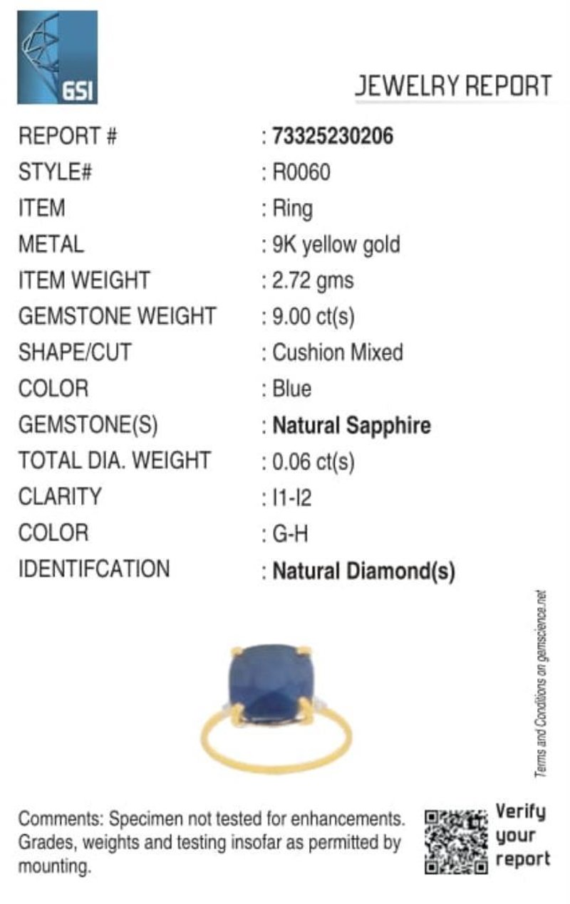 9CT YELLOW GOLD NATURAL BLUE SAPPHIRE & DIAMOND RING Weight Of The Item: 2.72 GFineness Of Metal(S): Yellow Gold 9KtThe Ring Consists Of (1) Cushion Brilliant Natural Blue Sapphire. Surrounding The Main Stones Are Round Brilliant Cut Natural Diamonds.Antique StyleIdentification: Natural Blue SapphireColor: BlueShape: Cushion Brilliant CutNo. Of Stone: 1Dimension: 10 Mm X 10 Mm X 6 MmWeight: 9 CaratsCut: Very GoodIdentification: Natural DiamondShape: Round Brilliant CutWeight: 0.06 CtsCut: Excellent. Certificates Are Provided By Gemological Science International (Gsi), An Independent Third-Party Gemological Laboratory Based In The Usa And Recognised Among The Top 10 Gem Labs Globally Markings: 9ct Condition: Good - Refer Images 0488238+45