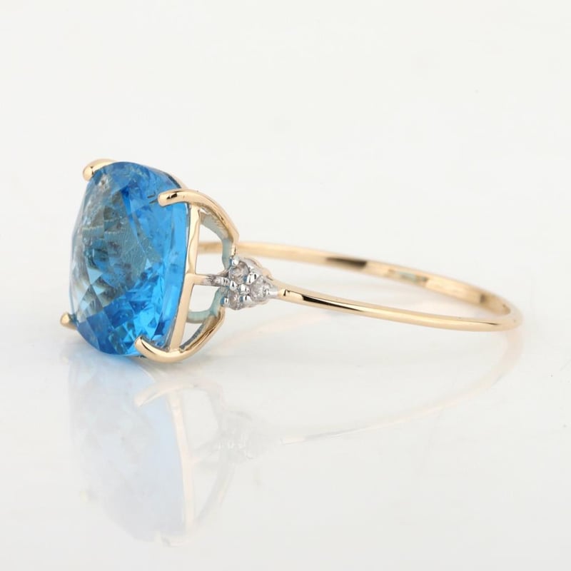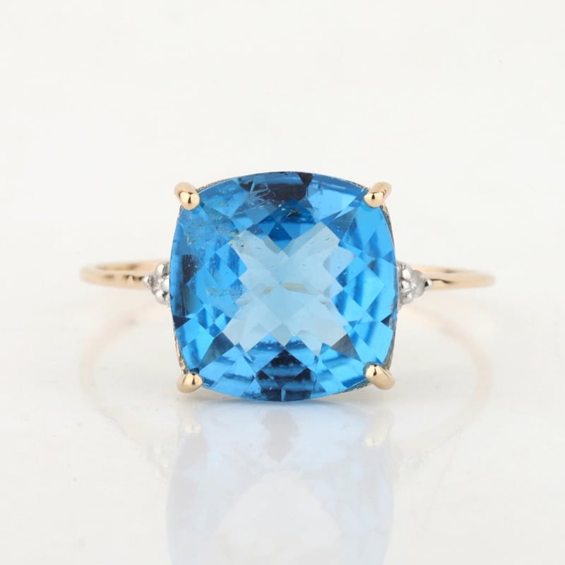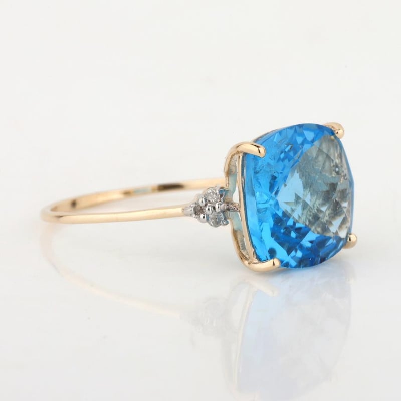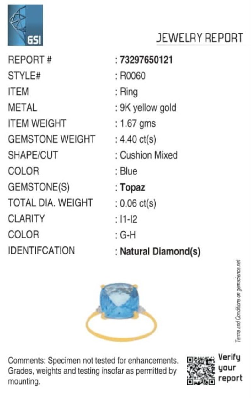 9CT YELLOW GOLD NATURAL SWISS BLUE TOPAZ & DIAMOND RING Weight Of The Item: 1.67 GFineness Of Metal(S): Yellow Gold 9KtThe Ring Consists Of (1) Cushion Brilliant Natural Swiss Blue Topaz. Surrounding The Main Stones Are Round Brilliant Cut Natural Diamonds.Antique StyleIdentification: Natural Swiss Blue TopazColor: BlueShape: Cushion Brilliant CutNo. Of Stone: 1Dimension: 10 Mm X 10 Mm X 6 MmWeight: 4.4 CaratsCut: Very GoodIdentification: Natural DiamondShape: Round Brilliant CutWeight: 0.06 CtsCut: Excellent. Certificates Are Provided By Gemological Science International (Gsi), An Independent Third-Party Gemological Laboratory Based In The Usa And Recognised Among The Top 10 Gem Labs Globally Markings: 9ct Condition: Good - Refer Images 0488238+48