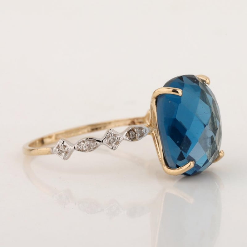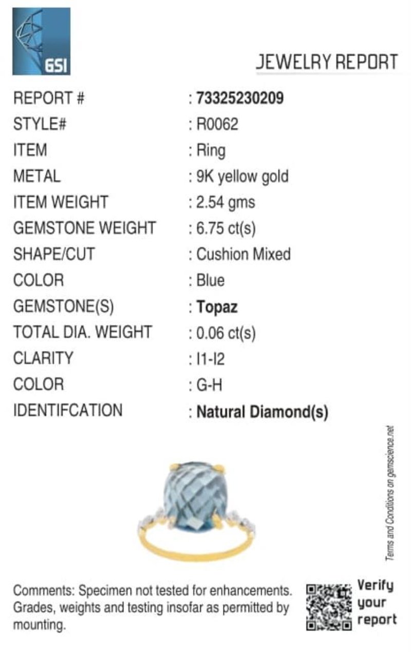 9CT YELLOW GOLD NATURAL LONDON BLUE TOPAZ & DIAMOND RING Weight Of The Item: 2.54 GFineness Of Metal(S): Yellow Gold 9KtThe Ring Consists Of (1) Octagon Brilliant Natural London Blue Topaz. Surrounding The Main Stones Are Round Brilliant Cut Natural Diamonds.Antique StyleIdentification: Natural London Blue TopazColor: BlueShape: Octagon Brilliant CutNo. Of Stone: 1Dimension: 12 Mm X 10 Mm X 7.2 MmWeight: 6.75 CaratsCut: Very GoodIdentification: Natural DiamondShape: Round Brilliant CutWeight: 0.06 CtsCut: Excellent. Certificates Are Provided By Gemological Science International (Gsi), An Independent Third-Party Gemological Laboratory Based In The Usa And Recognised Among The Top 10 Gem Labs Globally Markings: 9ct Condition: Good - Refer Images 0488238+51