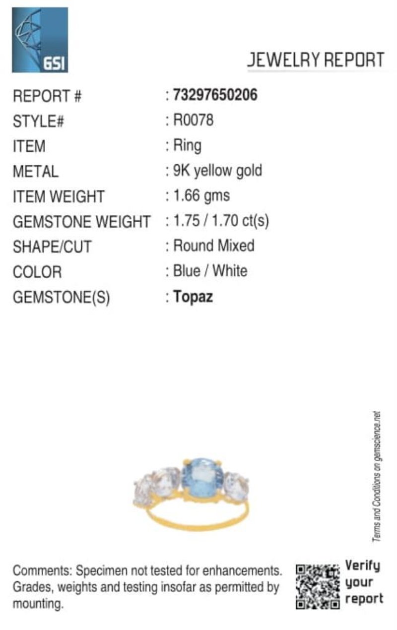 9CT YELLOW GOLD NATURAL SWISS BLUE TOPAZ / NATURAL WHITE TOPAZ RING Weight Of The Item: 1.66 GFineness Of Metal(S): Yellow Gold 9KtThe Ring Consists Of (1) Round Brilliant Natural Swiss Blue Topaz & (3) Round Brilliant Cut White Topaz.Antique StyleIdentification: Natural Swiss Blue Topaz / Natural White TopazColor: Blue / WhiteShape: Round Brilliant Cut / Round Faceted CutNo. Of Stone: 4Dimension: 8 Mm X 8 Mm X 4.8 MmWeight: 1.75 Carats / 1.7 CaratsCut: Very Good. Certificates Are Provided By Gemological Science International (Gsi), An Independent Third-Party Gemological Laboratory Based In The Usa And Recognised Among The Top 10 Gem Labs Globally Markings: 9ct Condition: Good - Refer Images 0488238+69