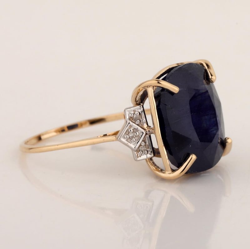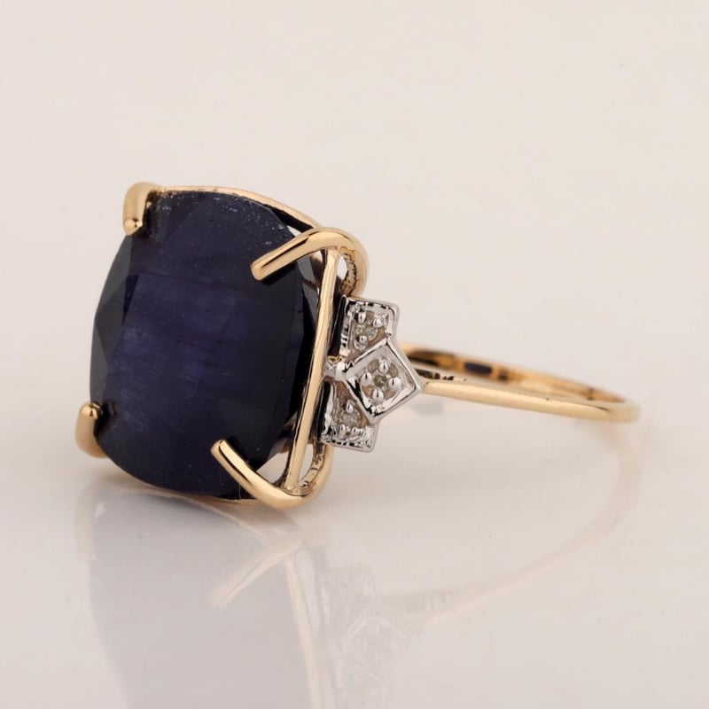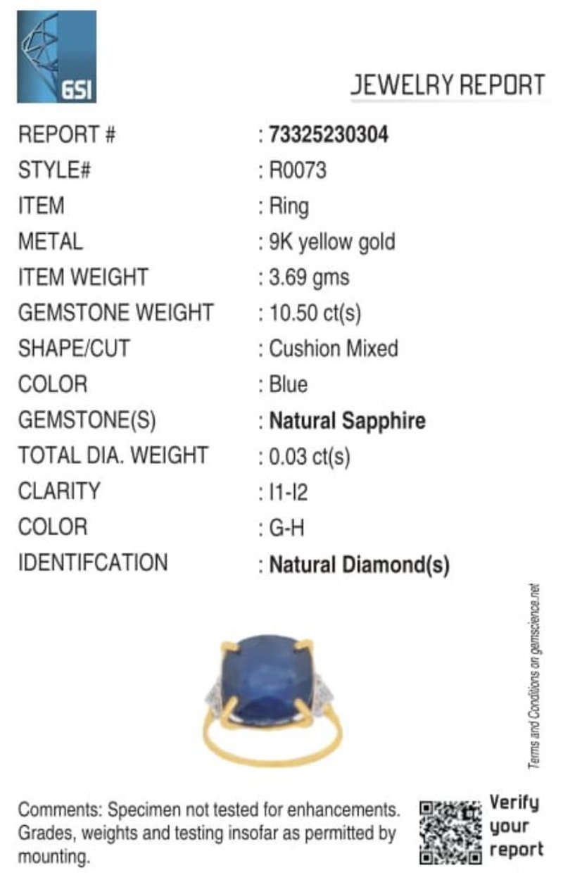 9CT YELLOW GOLD NATURAL BLUE SAPPHIRE & DIAMOND RING Weight Of The Item: 3.69 G Fineness Of Metal(S): Yellow Gold 9Kt The Ring Consists Of (1) Cushion Brilliant Natural Blue Sapphire. Surrounding The Main Stones Are Round Brilliant Cut Natural Diamonds. Antique Style Identification: Natural Blue Sapphire Color: Blue Shape: Cushion Brilliant Cut No. Of Stone: 1 Dimension: 13 Mm X 13 Mm X 7.8 Mm Weight: 10.5 Carats Cut: Very Good Identification: Natural Diamond Shape: Round Brilliant Cut Weight: 0.03 Cts Cut: Excellent. Certificates Are Provided By Gemological Science International (Gsi), An Independent Third-Party Gemological Laboratory Based In The Usa And Recognised Among The Top 10 Gem Labs Globally Markings: 9ct Condition: Good - Refer Images 0 488238+81