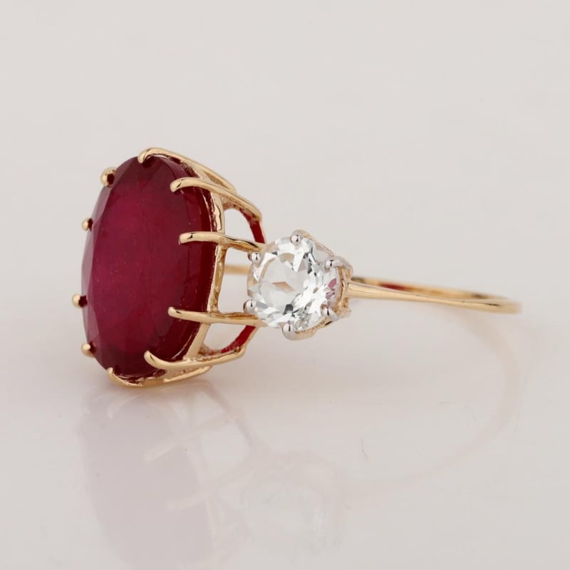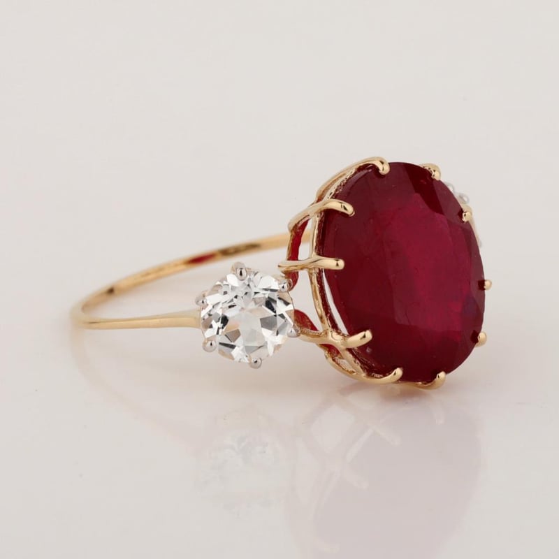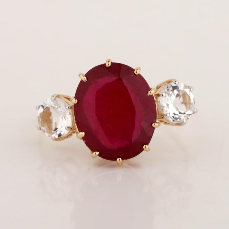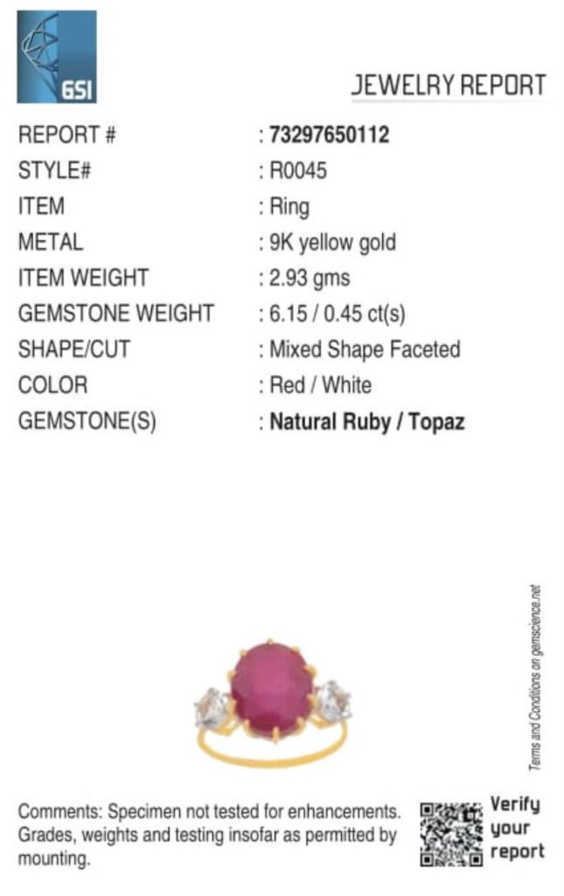 9CT YELLOW GOLD NATURAL RUBY / NATURAL WHITE TOPAZ RING Weight Of The Item: 2.93 GFineness Of Metal(S): Yellow Gold 9KtThe Ring Consists Of (1) Oval Brilliant Natural Ruby & (2) Round Brilliant Cut White Topaz.Antique StyleIdentification: Natural Ruby / Natural White TopazColor: Red / WhiteShape: Oval Brilliant Cut / Round Faceted CutNo. Of Stone: 3Dimension: 12 Mm X 10 Mm X 7.2 MmWeight: 6.15 Carats / 0.45 CaratsCut: Very Good. Certificates Are Provided By Gemological Science International (Gsi), An Independent Third-Party Gemological Laboratory Based In The Usa And Recognised Among The Top 10 Gem Labs Globally Markings: 9ct Condition: Good - Refer Images 0488238+18