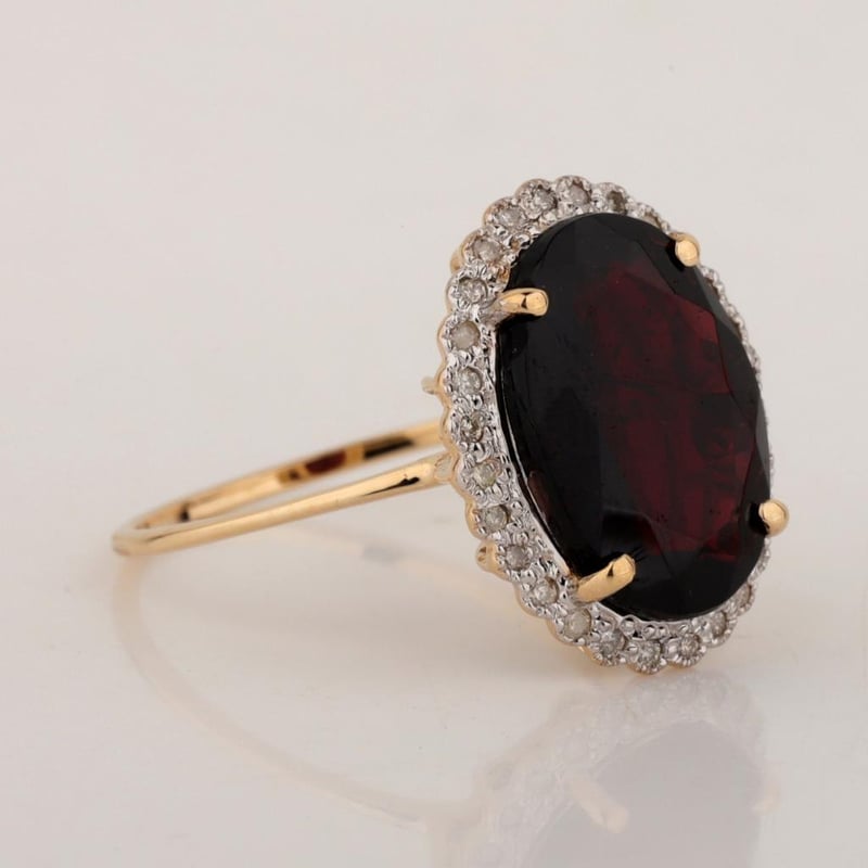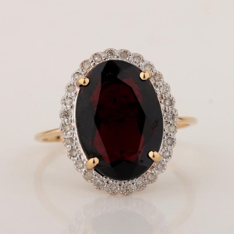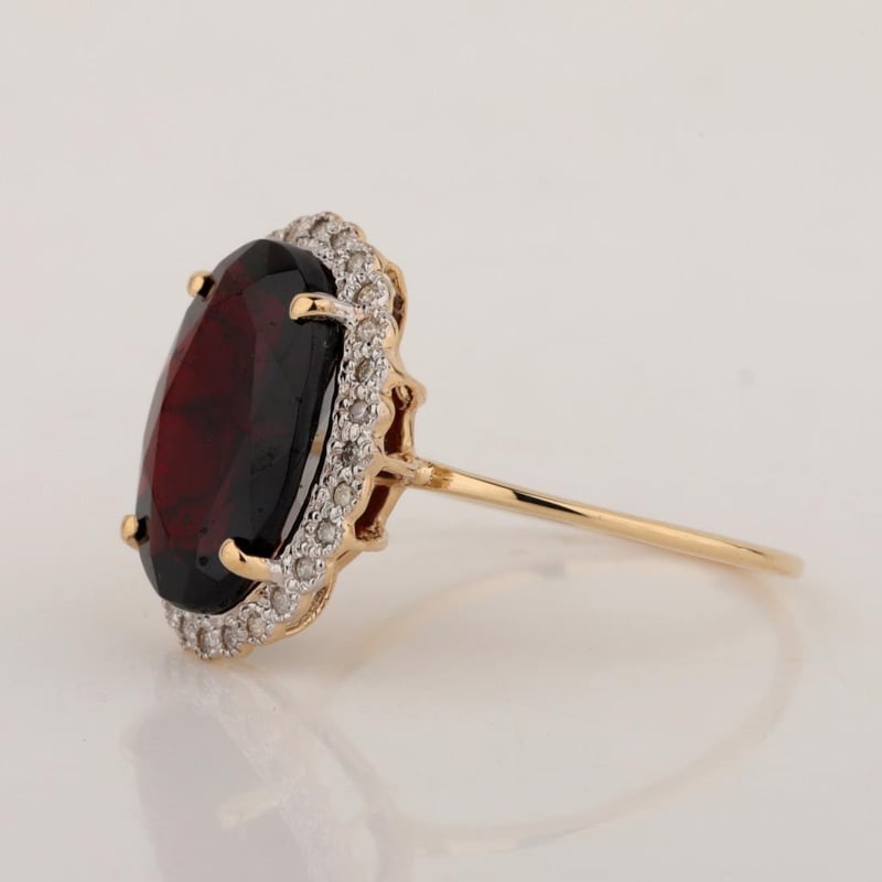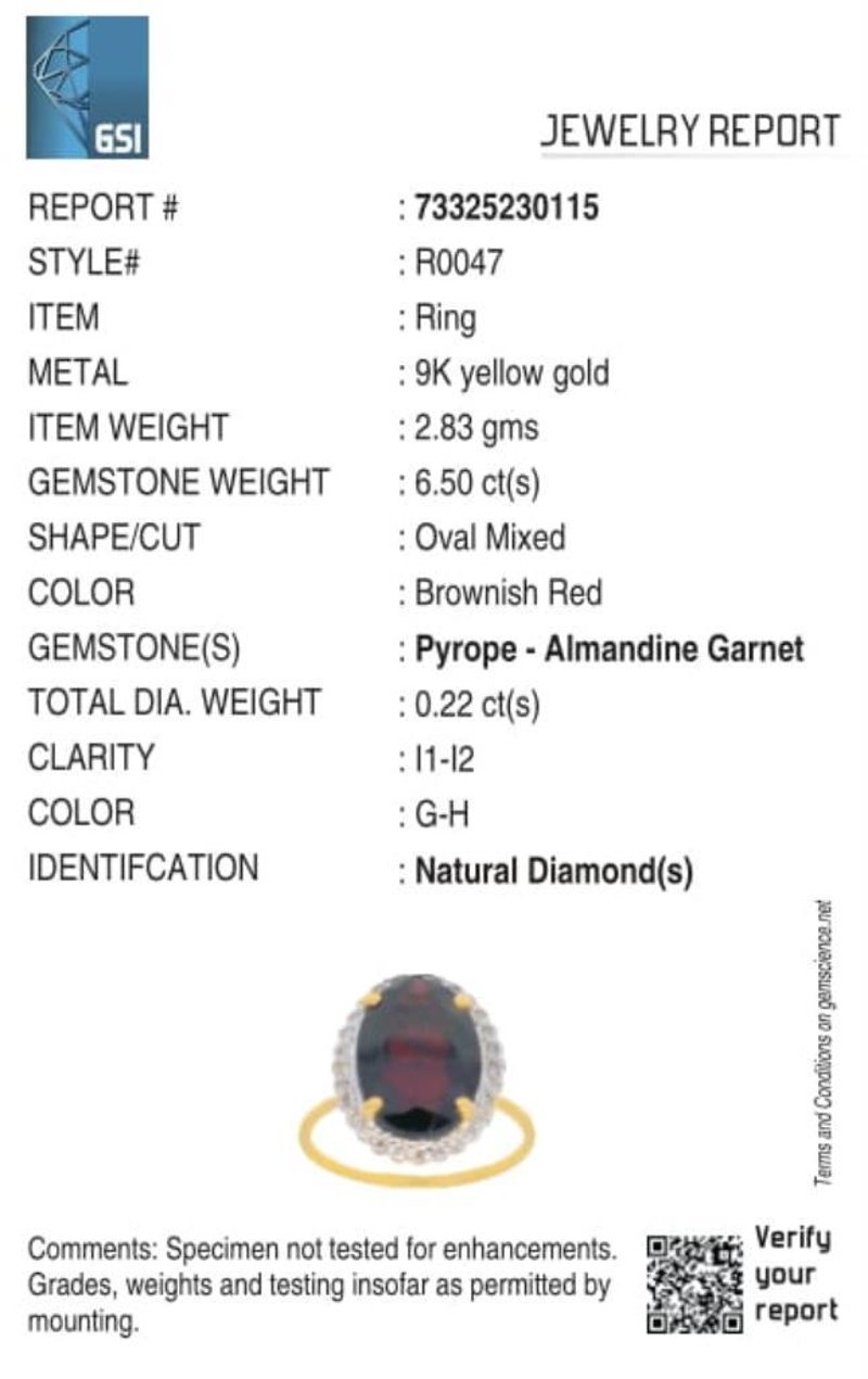 9CT YELLOW GOLD NATURAL GARNET & DIAMOND RING Weight Of The Item: 2.83 GFineness Of Metal(S): Yellow Gold 9KtThe Ring Consists Of (1) Oval Brilliant Natural Garnet. Surrounding The Main Stones Are Round Brilliant Cut Natural Diamonds.Antique StyleIdentification: Natural GarnetColor: RedShape: Oval Brilliant CutNo. Of Stone: 1Dimension: 14 Mm X 10 Mm X 8.4 MmWeight: 6.5 CaratsCut: Very GoodIdentification: Natural DiamondShape: Round Brilliant CutWeight: 0.22 CtsCut: Excellent. Certificates Are Provided By Gemological Science International (Gsi), An Independent Third-Party Gemological Laboratory Based In The Usa And Recognised Among The Top 10 Gem Labs Globally Markings: 9ct Condition: Good - Refer Images 0488238+22