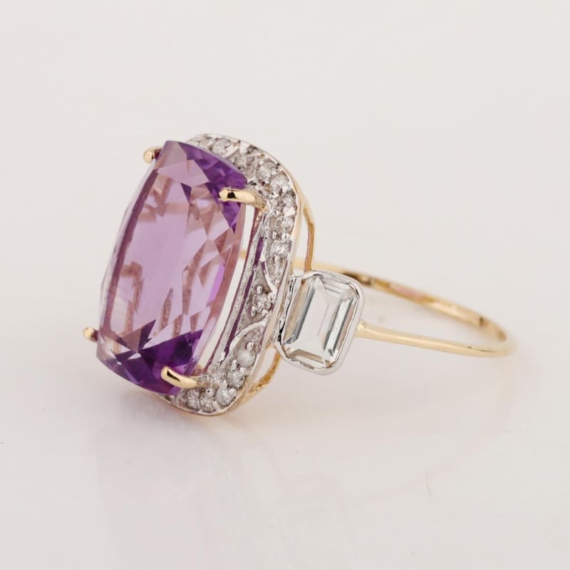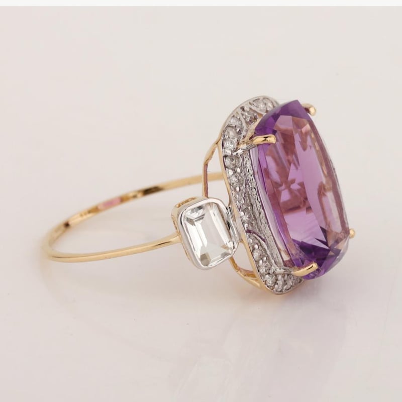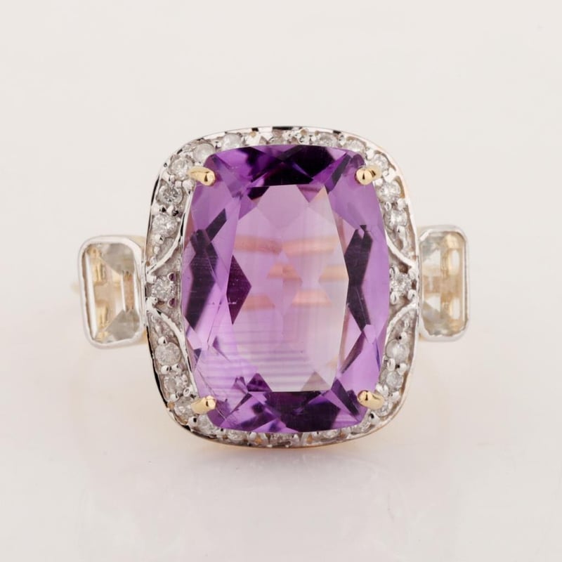9CT YELLOW GOLD NATURAL AMETHYST / NATURAL WHITE TOPAZ & DIAMOND RING Weight Of The Item: 2.83 GFineness Of Metal(S): Yellow Gold 9KtThe Ring Consists Of (1) Cushion Brilliant Natural Amethyst & (2) Round Brilliant Cut White Topaz. Surrounding The Main Stones Are Round Brilliant Cut Natural Diamonds.Antique StyleIdentification: Natural Amethyst / Natural White TopazColor: Purple / WhiteShape: Cushion Brilliant Cut / Octagon Faceted CutNo. Of Stone: 3Dimension: 14 Mm X 10 Mm X 8.4 MmWeight: 5.35 Carats / 0.7 CaratsCut: Very GoodIdentification: Natural DiamondShape: Round Brilliant CutWeight: 0.24 CtsCut: Excellent. Certificates Are Provided By Gemological Science International (Gsi), An Independent Third-Party Gemological Laboratory Based In The Usa And Recognised Among The Top 10 Gem Labs Globally Markings: 9ct Condition: Good - Refer Images 0488238+24