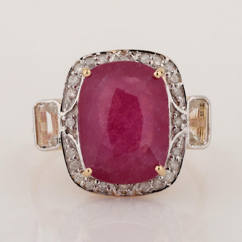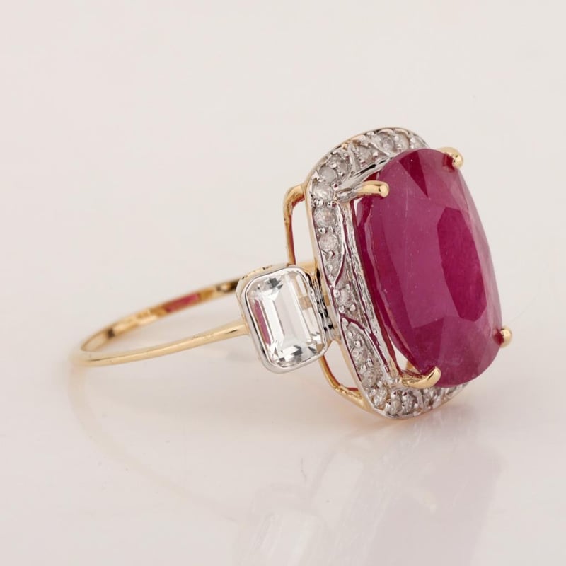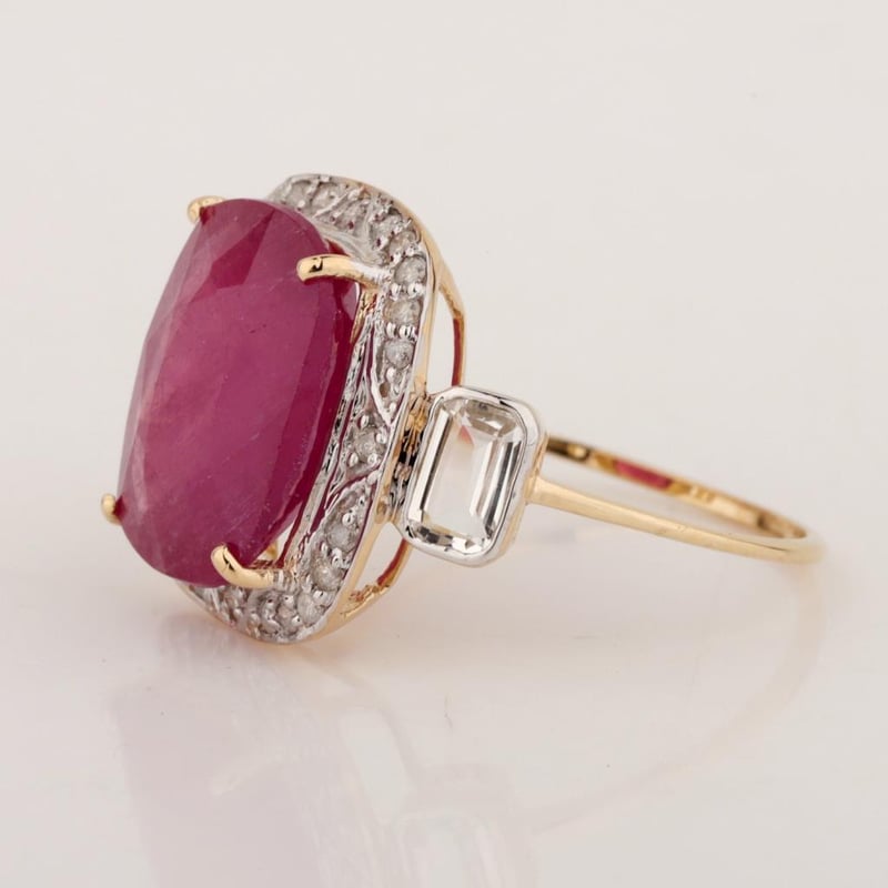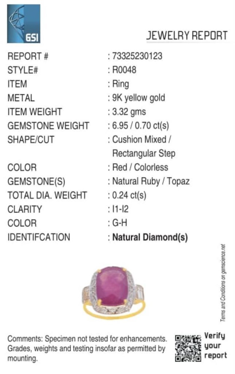 9CT YELLOW GOLD NATURAL RUBY / NATURAL WHITE TOPAZ & DIAMOND RING Weight Of The Item: 3.32 GFineness Of Metal(S): Yellow Gold 9KtThe Ring Consists Of (1) Cushion Brilliant Natural Ruby & (2) Round Brilliant Cut White Topaz. Surrounding The Main Stones Are Round Brilliant Cut Natural Diamonds.Antique StyleIdentification: Natural Ruby / Natural White TopazColor: Red / WhiteShape: Cushion Brilliant Cut / Octagon Faceted CutNo. Of Stone: 3Dimension: 14 Mm X 10 Mm X 8.4 MmWeight: 6.95 Carats / 0.7 CaratsCut: Very GoodIdentification: Natural DiamondShape: Round Brilliant CutWeight: 0.24 CtsCut: Excellent. Certificates Are Provided By Gemological Science International (Gsi), An Independent Third-Party Gemological Laboratory Based In The Usa And Recognised Among The Top 10 Gem Labs Globally Markings: 9ct Condition: Good - Refer Images 0488238+30