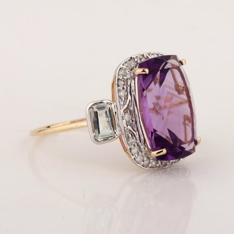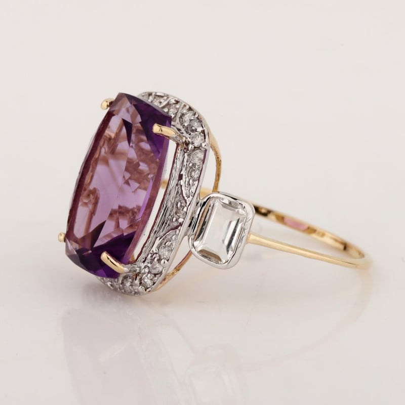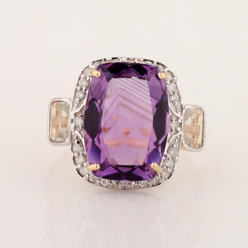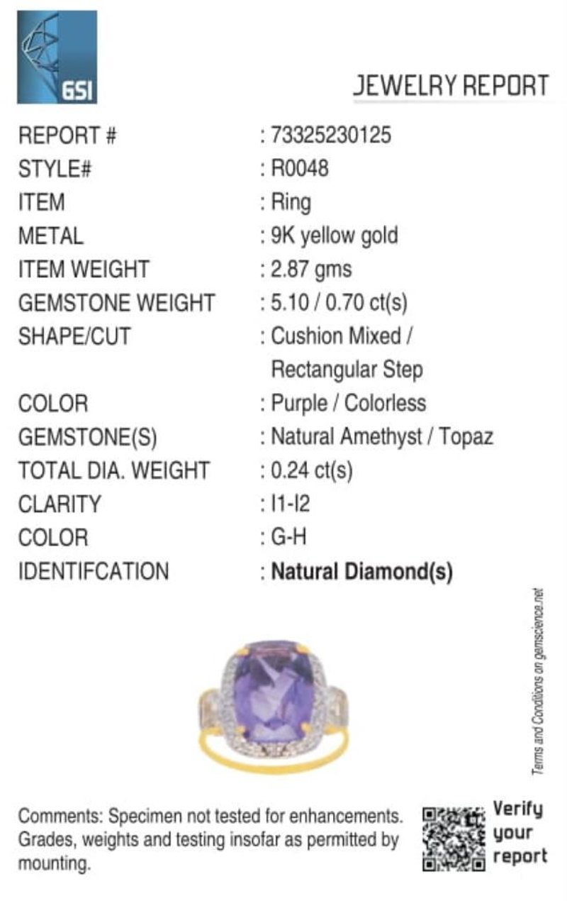 9CT YELLOW GOLD NATURAL AMETHYST / NATURAL WHITE TOPAZ & DIAMOND RING Weight Of The Item: 2.87 GFineness Of Metal(S): Yellow Gold 9KtThe Ring Consists Of (1) Cushion Brilliant Natural Amethyst & (2) Round Brilliant Cut White Topaz. Surrounding The Main Stones Are Round Brilliant Cut Natural Diamonds.Antique StyleIdentification: Natural Amethyst / Natural White TopazColor: Purple / WhiteShape: Cushion Brilliant Cut / Octagon Faceted CutNo. Of Stone: 3Dimension: 14 Mm X 10 Mm X 8.4 MmWeight: 5.1 Carats / 0.7 CaratsCut: Very GoodIdentification: Natural DiamondShape: Round Brilliant CutWeight: 0.24 CtsCut: Excellent. Certificates Are Provided By Gemological Science International (Gsi), An Independent Third-Party Gemological Laboratory Based In The Usa And Recognised Among The Top 10 Gem Labs Globally Markings: 9ct Condition: Good - Refer Images 0488238+32