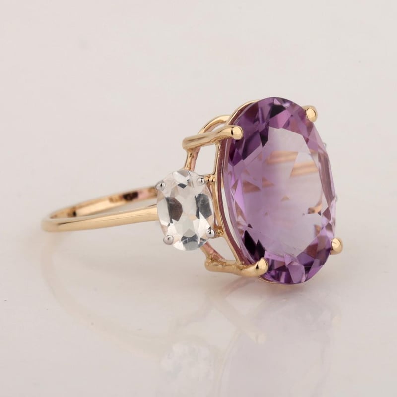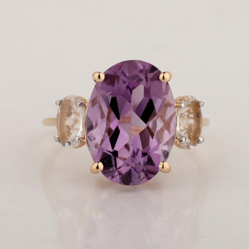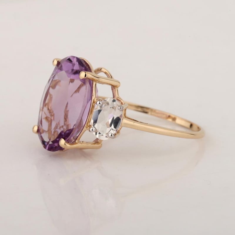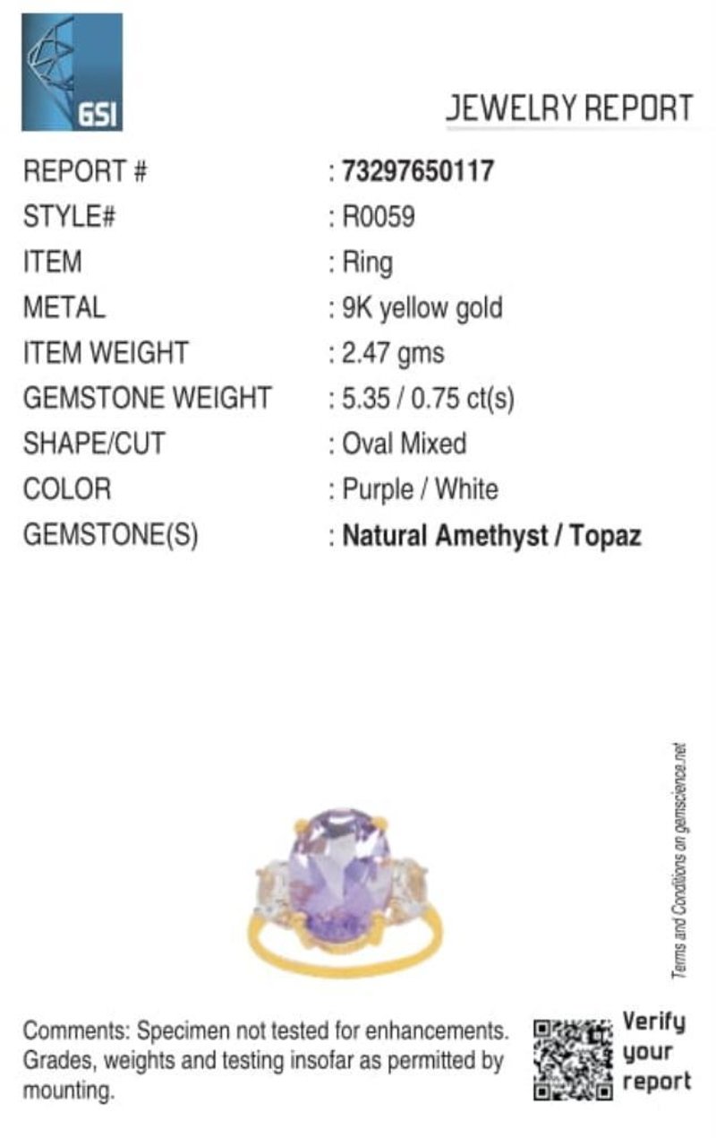 9CT YELLOW GOLD NATURAL AMETHYST / NATURAL WHITE TOPAZ RING Weight Of The Item: 2.47 GFineness Of Metal(S): Yellow Gold 9KtThe Ring Consists Of (1) Oval Brilliant Natural Amethyst & (2) Round Brilliant Cut White Topaz.Antique StyleIdentification: Natural Amethyst / Natural White TopazColor: Purple / WhiteShape: Oval Brilliant Cut / Oval Faceted CutNo. Of Stone: 3Dimension: 14 Mm X 10 Mm X 8.4 MmWeight: 5.35 Carats / 0.75 CaratsCut: Very Good. Certificates Are Provided By Gemological Science International (Gsi), An Independent Third-Party Gemological Laboratory Based In The Usa And Recognised Among The Top 10 Gem Labs Globally Markings: 9ct Condition: Good - Refer Images 0488238+42