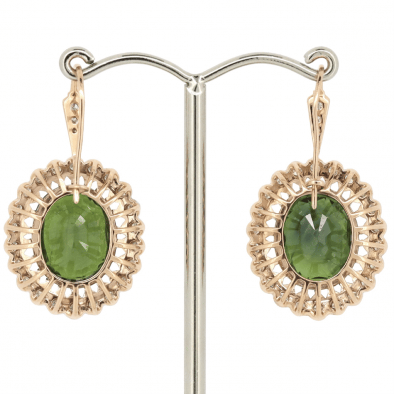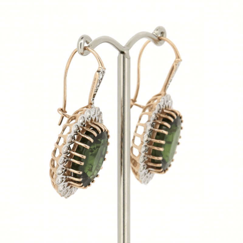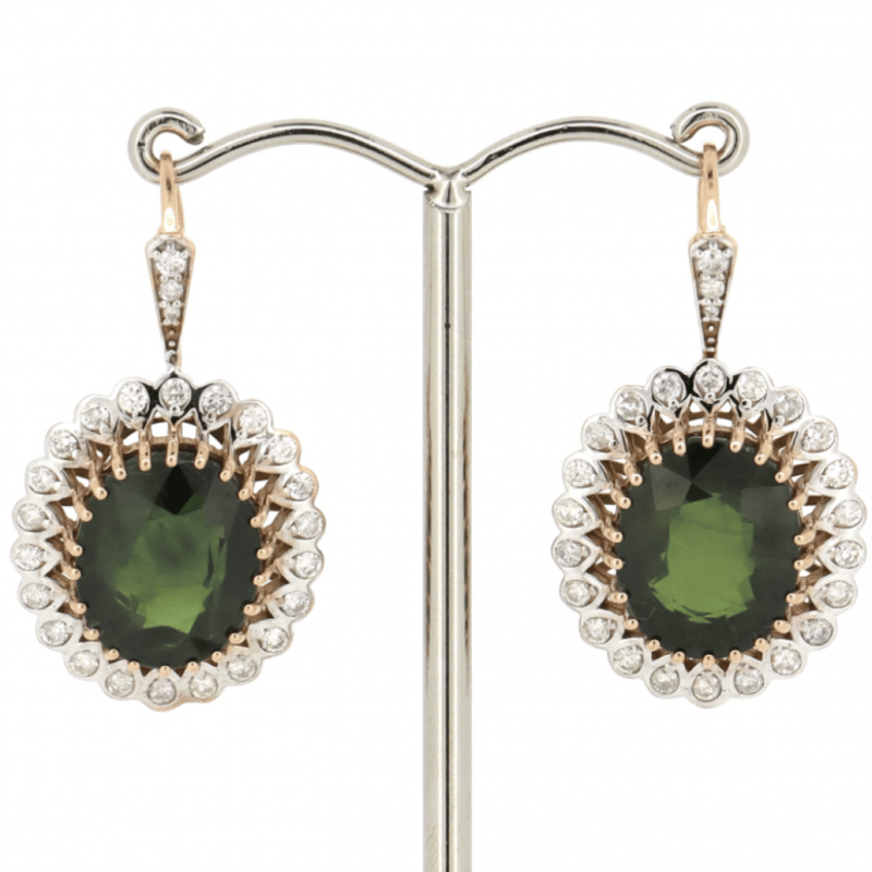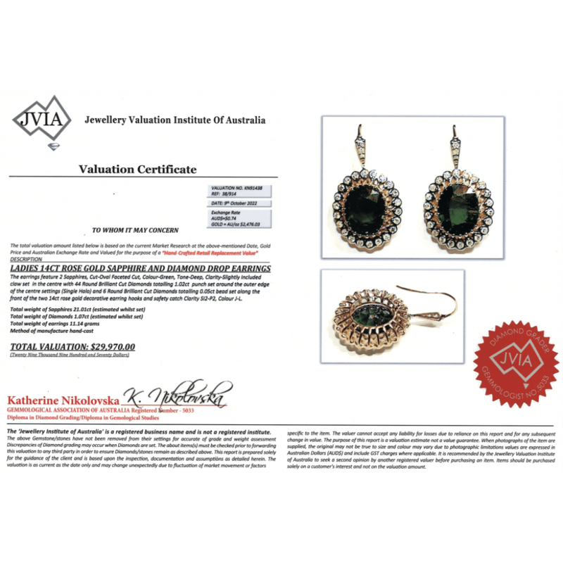 14K ROSE GOLD, GREEN SAPPHIRE AND DIAMOND, ANTIQUE INSPIRED DROP EARRINGS. THE CENTRES FEATURE, 2 OVAL FACETED CUT, DEEP GREEN, SAPPHIRES (21.01CT TSW, SLIGHTLY INCLUDED), CLAW SET. SURROUNDING THE CENTRES AND DECORATING THE HOOKS ARE, 50 ROUND BRILLIANT CUT, DIAMONDS (1.07CT TDW, J-L COLOUR, SI2-P2 CLARITY), BEAD SET. THE EARRINGS FEATURE HOOK AND CATCH CLOSURES. Valuations Provided by an Independent Third-Party Professional Not Directly Associated With Lloyds Auctions at AUD $$29,970.00This valuation has been conducted by an independent third-party professional. The valuation amount is an assessment by the issuing valuer and does not reflect the auction value of the item. Any inquiries regarding the valuation should be directed to the issuing valuer (refer to contact details on the certificate), as Lloyds Auctions has no affiliation or influence over the valuation, the valuer, or the stated amount. Condition: Good - Refer Images 0645858+1634
