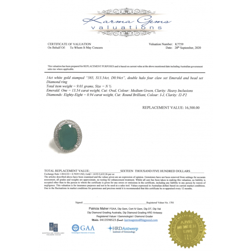 14K WHITE GOLD, 13.54CT EMERALD AND DIAMOND, STATEMENT RING. THE CENTRE FEATURES, ONE OVAL CUT, MEDIUM GREEN, EMERALD (13.54CT, HEAVY INCLUSIONS), CLAW SET. SURROUNDING THE CENTRE IN A DOUBLE HALO AND DECORATING THE BAND ARE, 88 ROUND BRILLIANT CUT, DIAMONDS (0.94CT TDW, I-J COLOUR, I2-P2 CLARITY), BEAD SET. RING SIZE N 1/2.THE EMERALD HAS A NATURAL INCLUSION THAT HAS REACHED THE SURFACE. Valuations Provided by an Independent Third-Party Professional Not Directly Associated With Lloyds Auctions at AUD $$16,500.00This valuation has been conducted by an independent third-party professional. The valuation amount is an assessment by the issuing valuer and does not reflect the auction value of the item. Any inquiries regarding the valuation should be directed to the issuing valuer (refer to contact details on the certificate), as Lloyds Auctions has no affiliation or influence over the valuation, the valuer, or the stated amount. Condition: Good - Refer Images 0645858+1633
