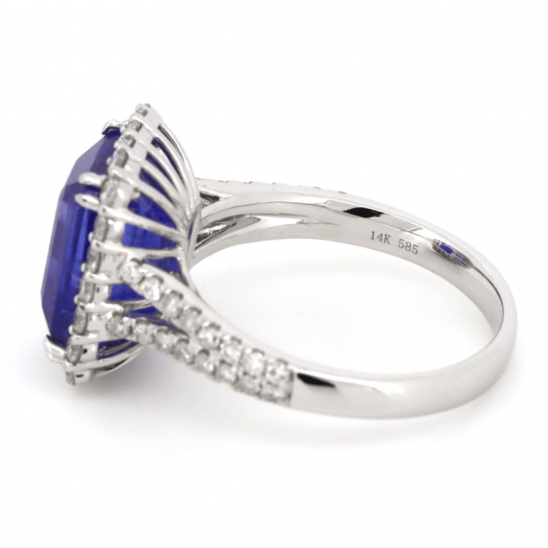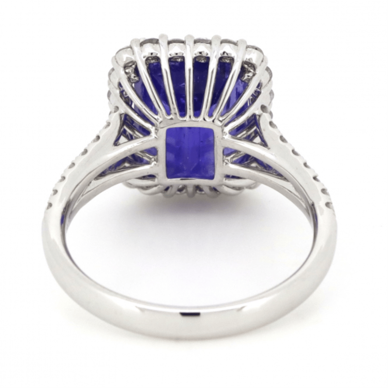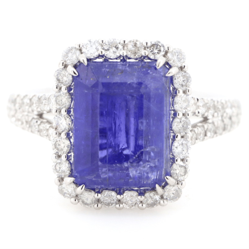 14K WHITE GOLD, TANZANITE AND DIAMOND, HALO SPLIT BAND RING. THE CENTRE FEATURES, ONE EMERALD CUT, MEDIUM DARK PURPLISH-BLUE, TANZANITE (5.49CT, MODERATE EYE VISIBLE INCLUSIONS), DOUBLE CLAW SET. SURROUNDING THE CENTRE IN A HALO AND DECORATING THE BAND ARE, 54 ROUND BRILLIANT CUT, DIAMONDS (0.69CT TDW, J-K COLOUR, SI2-I2 CLARITY), MICRO-CLAW SET. RING SIZE M.THE TANZANITE HAS SOME NATURAL INCLUSIONS THAT HAVE REACHED THE SURFACE. Valuations Provided by an Independent Third-Party Professional Not Directly Associated With Lloyds Auctions at AUD $$11,490.00This valuation has been conducted by an independent third-party professional. The valuation amount is an assessment by the issuing valuer and does not reflect the auction value of the item. Any inquiries regarding the valuation should be directed to the issuing valuer (refer to contact details on the certificate), as Lloyds Auctions has no affiliation or influence over the valuation, the valuer, or the stated amount. Condition: Good - Refer Images 0645858+1644