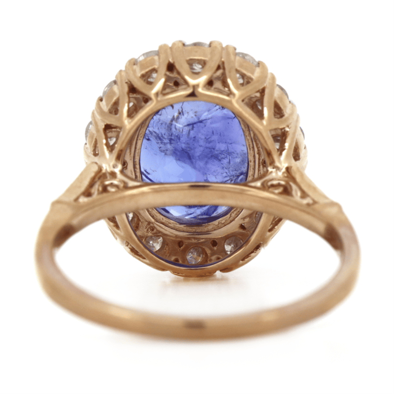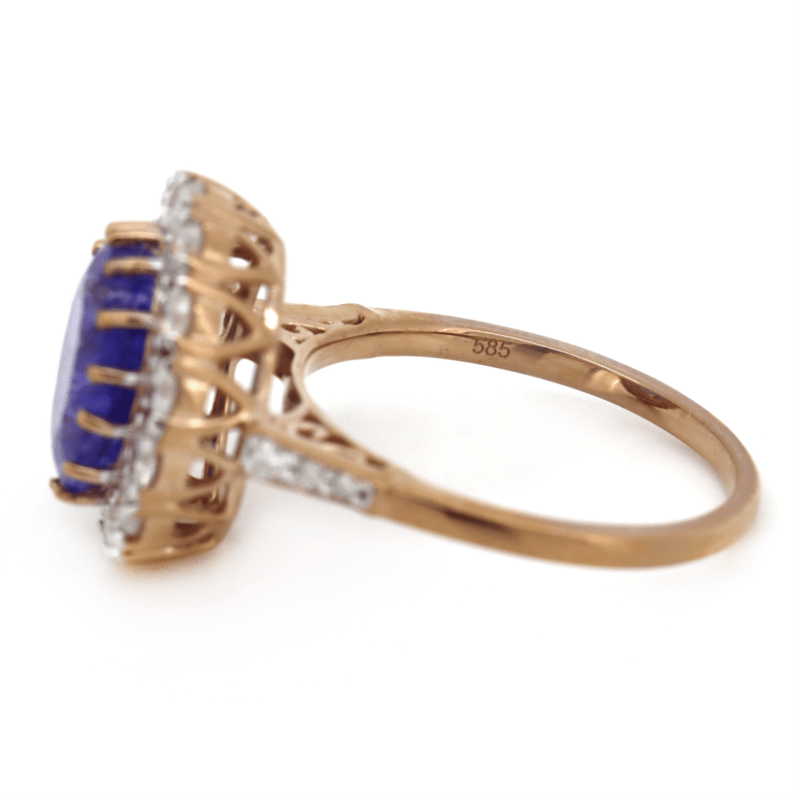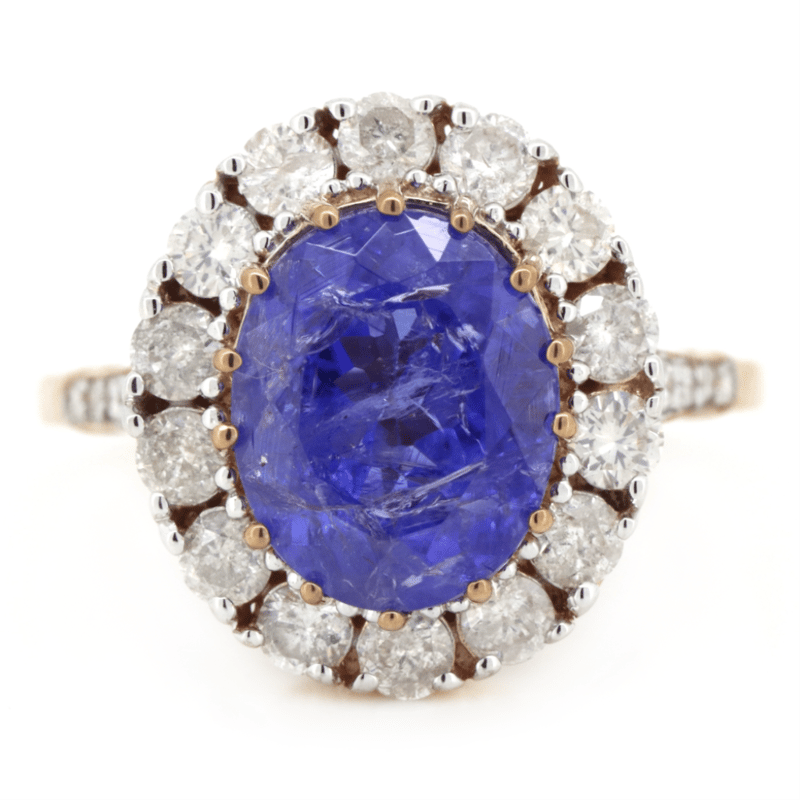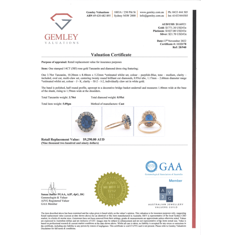 14K ROSE GOLD, TANZANITE AND DIAMOND, HALO RING. THE CENTRE FEATURES, ONE OVAL CUT, MEDIUM PURPLISH-BLUE, TANZANITE (3.70CT, INCLUDED), MULTI-CLAW SET. SURROUNDING THE CENTRE IN A HALO ARE, 20 ROUND BRILLIANT CUT, DIAMONDS (0.95CT TDW, J-K COLOUR, SI2-I2 CLARITY), INDIVIDUAL CLAW SET IN WHITE GOLD. RING SIZE N. Valuations Provided by an Independent Third-Party Professional Not Directly Associated With Lloyds Auctions at AUD $$9,290.00This valuation has been conducted by an independent third-party professional. The valuation amount is an assessment by the issuing valuer and does not reflect the auction value of the item. Any inquiries regarding the valuation should be directed to the issuing valuer (refer to contact details on the certificate), as Lloyds Auctions has no affiliation or influence over the valuation, the valuer, or the stated amount. Condition: Good - Refer Images 0645858+1696