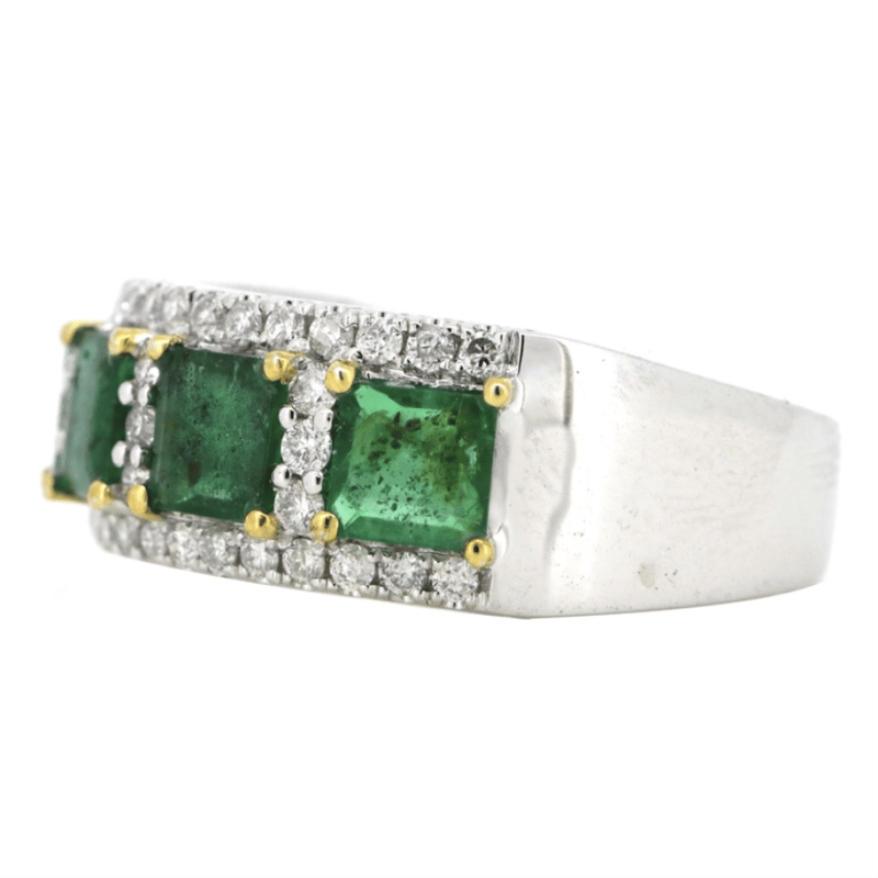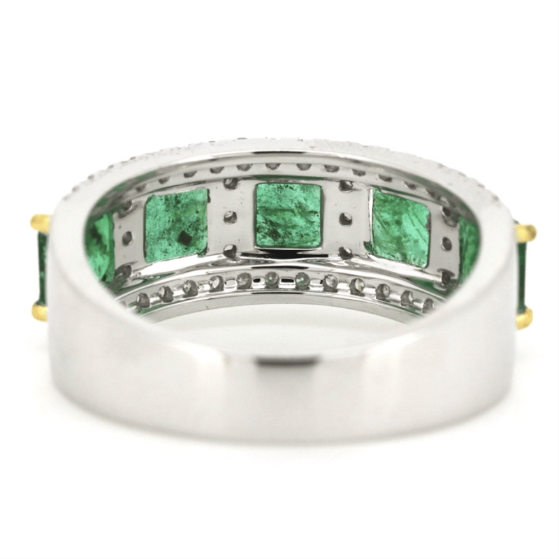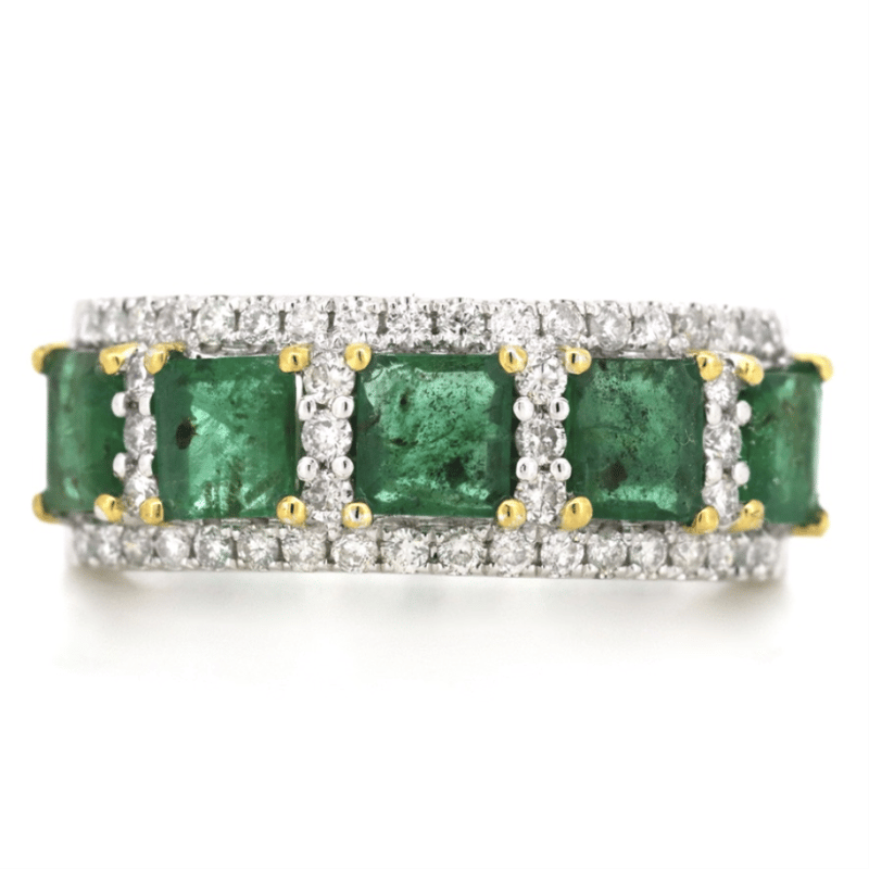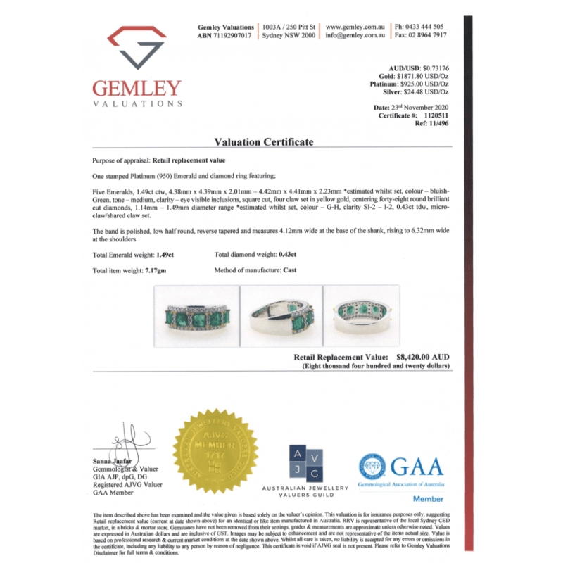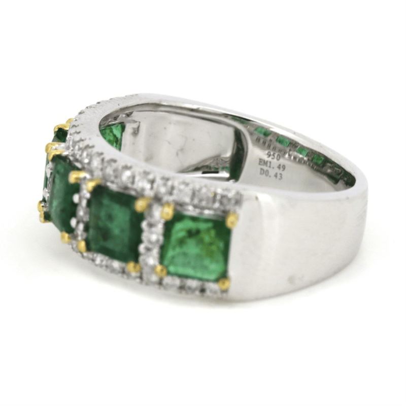 PLATINUM 950, EMERALD AND DIAMOND, DECORATIVE BAND RING. THE CENTRE FEATURES, 5 SQUARE CUT, MEDIUM BLUISH-GREEN, EMERALDS (1.49CT TSW, EYE VISIBLE INCLUSIONS), 4 CLAW SET IN YELLOW GOLD. DECORATING THE CENTRE ARE, 48 ROUND BRILLIANT CUT, DIAMONDS (0.43CT TDW, G-H COLOUR, SI2-I2 CLARITY), MICRO-CLAW/SHARED CLAW SET. RING SIZE M. Valuations Provided by an Independent Third-Party Professional Not Directly Associated With Lloyds Auctions at AUD $$8,420.00This valuation has been conducted by an independent third-party professional. The valuation amount is an assessment by the issuing valuer and does not reflect the auction value of the item. Any inquiries regarding the valuation should be directed to the issuing valuer (refer to contact details on the certificate), as Lloyds Auctions has no affiliation or influence over the valuation, the valuer, or the stated amount. Condition: Good - Refer Images 0645858+1626