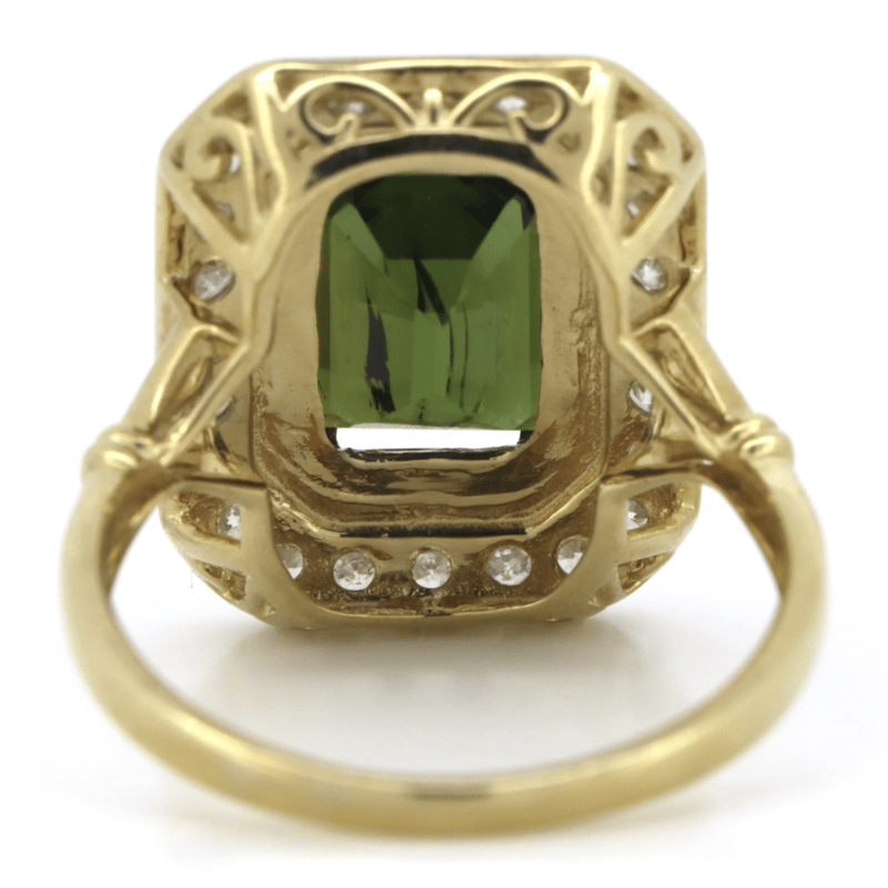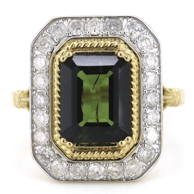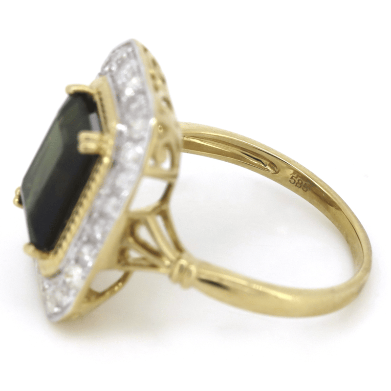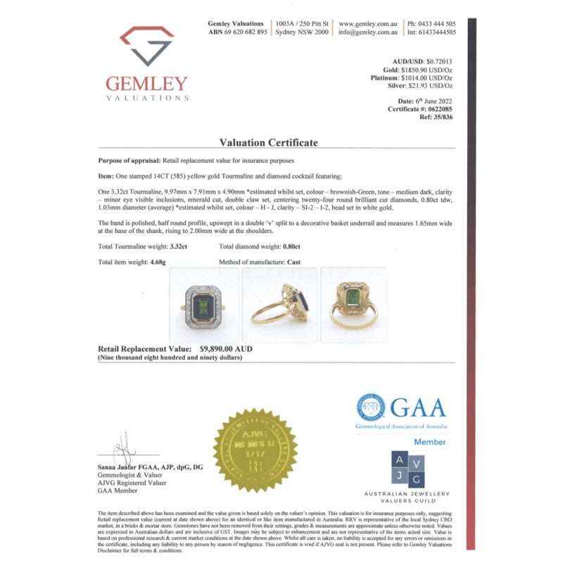 14K YELLOW GOLD, GREEN TOURMALINE AND DIAMOND, ANTIQUE INSPIRED RING. THE CENTRE FEATURES, ONE EMERALD CUT, MEDIUM-DARK BROWNISH-GREEN, TOURMALINE (3.32CT, MINOR EYE VISIBLE INCLUSIONS), DOUBLE CLAW SET. SURROUNDING THE CENTRE IN A HALO ARE, 24 ROUND BRILLIANT CUT, DIAMONDS (0.80CT TDW, H-J COLOUR, SI2-I2 CLARITY), BEAD SET IN WHITE GOLD. RING SIZE P. Valuations Provided by an Independent Third-Party Professional Not Directly Associated With Lloyds Auctions at AUD $$9,890.00This valuation has been conducted by an independent third-party professional. The valuation amount is an assessment by the issuing valuer and does not reflect the auction value of the item. Any inquiries regarding the valuation should be directed to the issuing valuer (refer to contact details on the certificate), as Lloyds Auctions has no affiliation or influence over the valuation, the valuer, or the stated amount. Condition: Good - Refer Images 0645858+1653