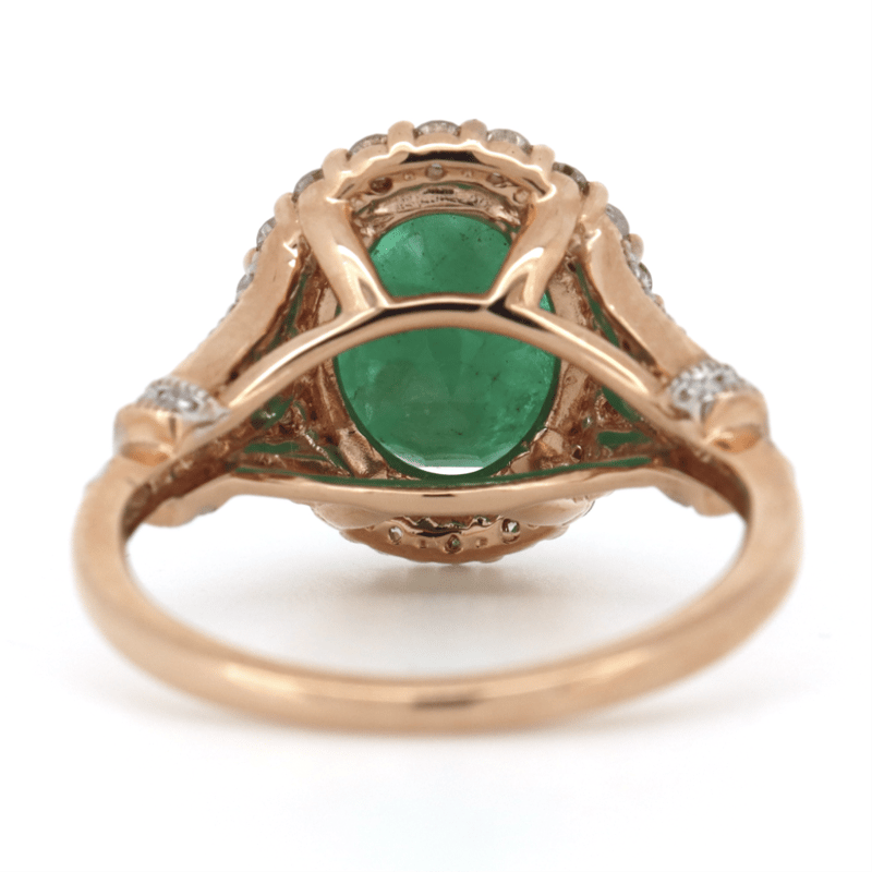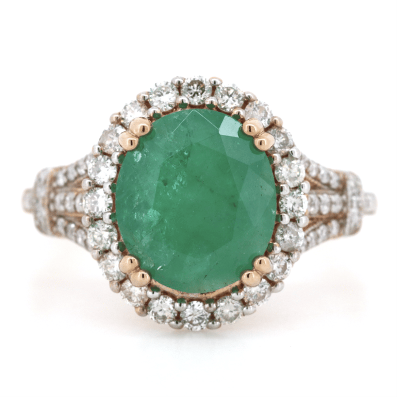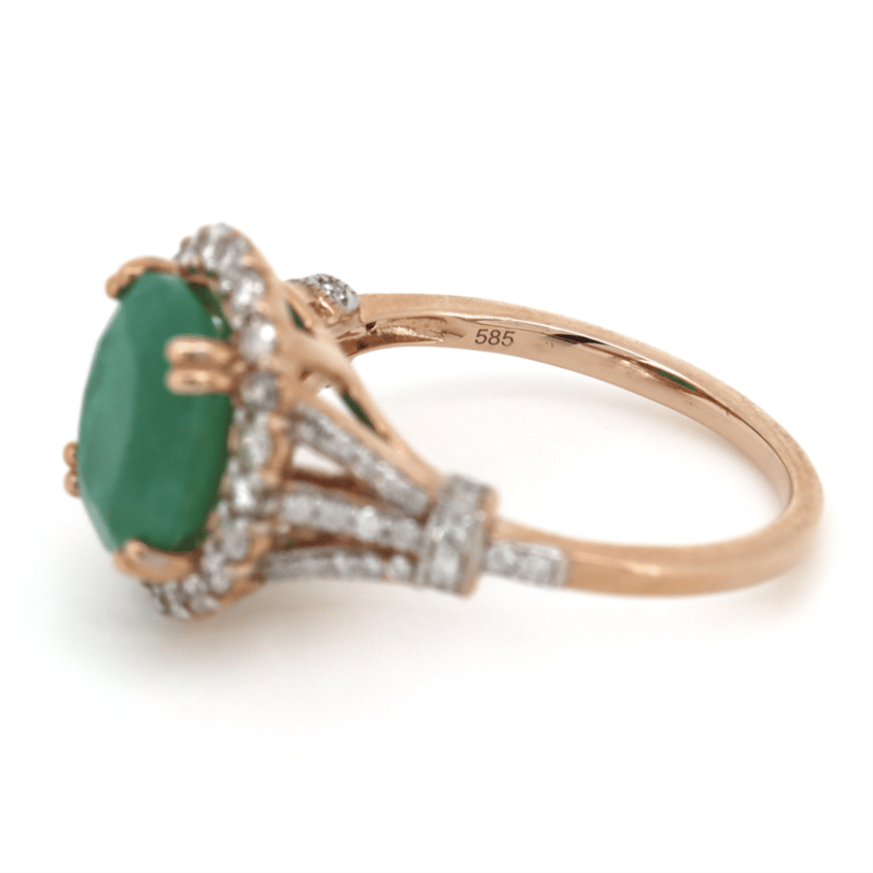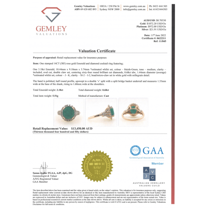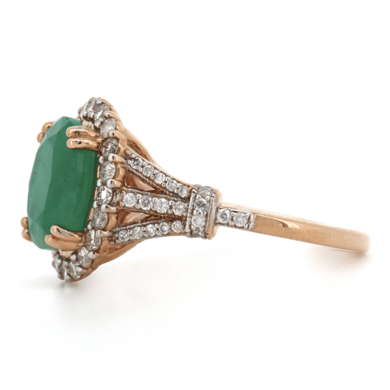 14K ROSE GOLD, EMERALD AND DIAMOND, HALO RING. THE CENTRE FEATURES, ONE OVAL CUT, MEDIUM BLUISH-GREEN, EMERALD (3.18CT, INCLUDED), DOUBLE 4 CLAW SET. SURROUNDING THE CENTRE IN A HALO AND DECORATING THE BAND ARE, 64 ROUND BRILLIANT CUT, DIAMONDS (0.68CT TDW, J-K COLOUR, SI2-I2 CLARITY), BEAD/MICRO-CLAW SET IN WHITE GOLD WITH MILLEGRAIN DETAIL. RING SIZE O 1/2. Valuations Provided by an Independent Third-Party Professional Not Directly Associated With Lloyds Auctions at AUD $$13,450.00This valuation has been conducted by an independent third-party professional. The valuation amount is an assessment by the issuing valuer and does not reflect the auction value of the item. Any inquiries regarding the valuation should be directed to the issuing valuer (refer to contact details on the certificate), as Lloyds Auctions has no affiliation or influence over the valuation, the valuer, or the stated amount. Condition: Good - Refer Images 0645858+1621