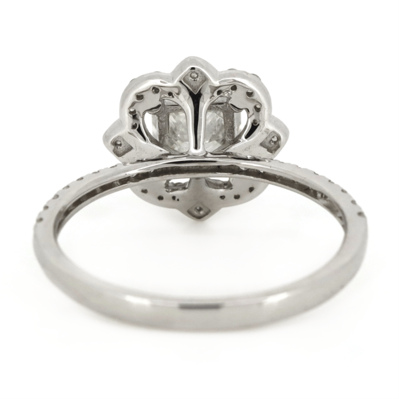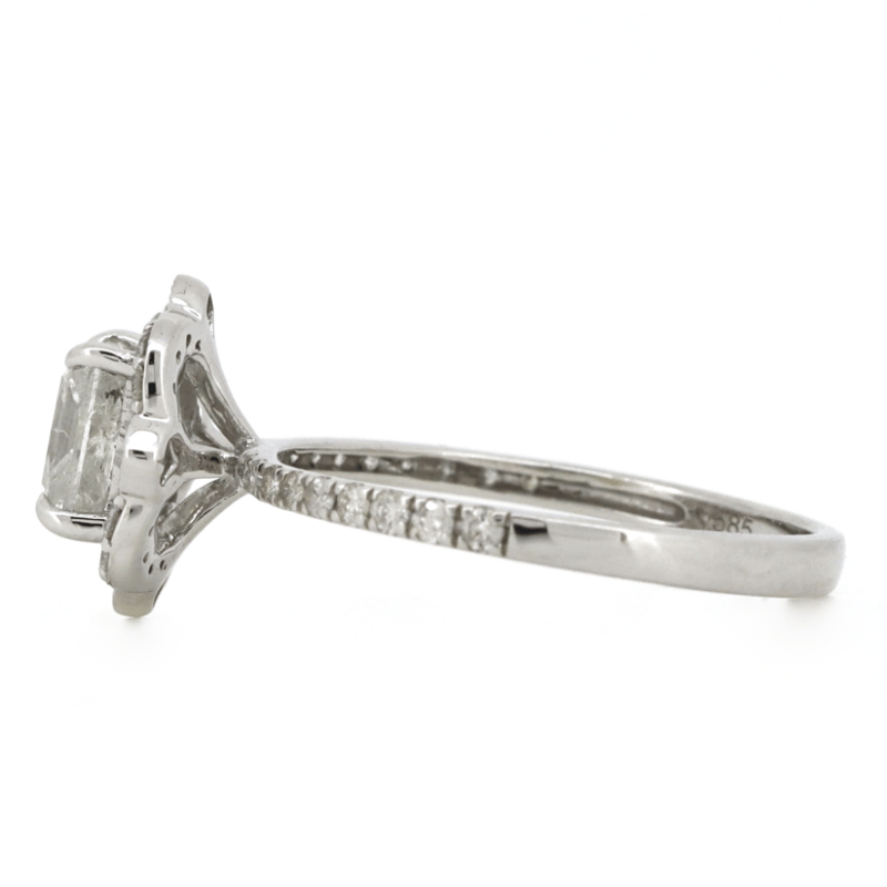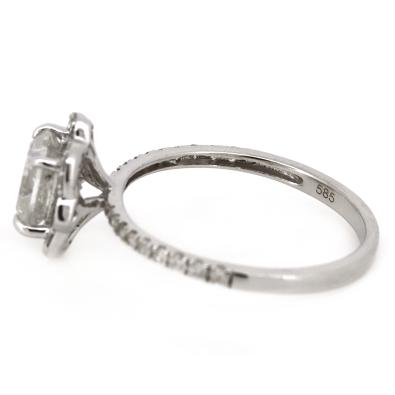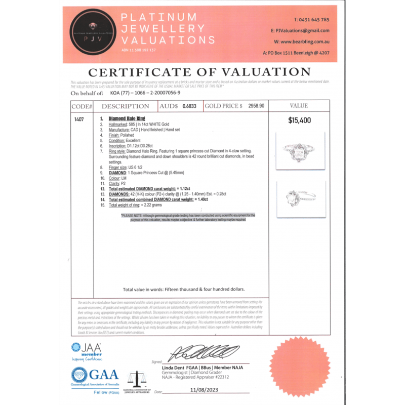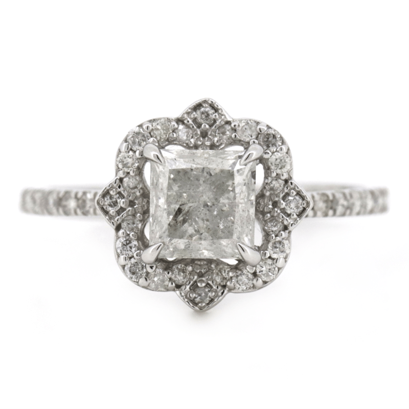14K WHITE GOLD AND DIAMOND, VINTAGE INSPIRED RING. THE CENTRE FEATURES, ONE SQUARE PRINCESS CUT, DIAMOND (1.12CT, L-M COLOUR, P2 CLARITY), 4 CLAW SET. SURROUNDING THE CENTRE IN A DECORATIVE HALO ARE AND DECORATING THE BAND ARE, 42 ROUND BRILLIANT CUT, DIAMONDS (0.28CT TDW, H-K COLOUR, P2+ CLARITY), BEAD SET. RING SIZE L 1/2. Valuations Provided by an Independent Third-Party Professional Not Directly Associated With Lloyds Auctions at AUD $$15,400.00This valuation has been conducted by an independent third-party professional. The valuation amount is an assessment by the issuing valuer and does not reflect the auction value of the item. Any inquiries regarding the valuation should be directed to the issuing valuer (refer to contact details on the certificate), as Lloyds Auctions has no affiliation or influence over the valuation, the valuer, or the stated amount. Condition: Good - Refer Images 0645858+1668