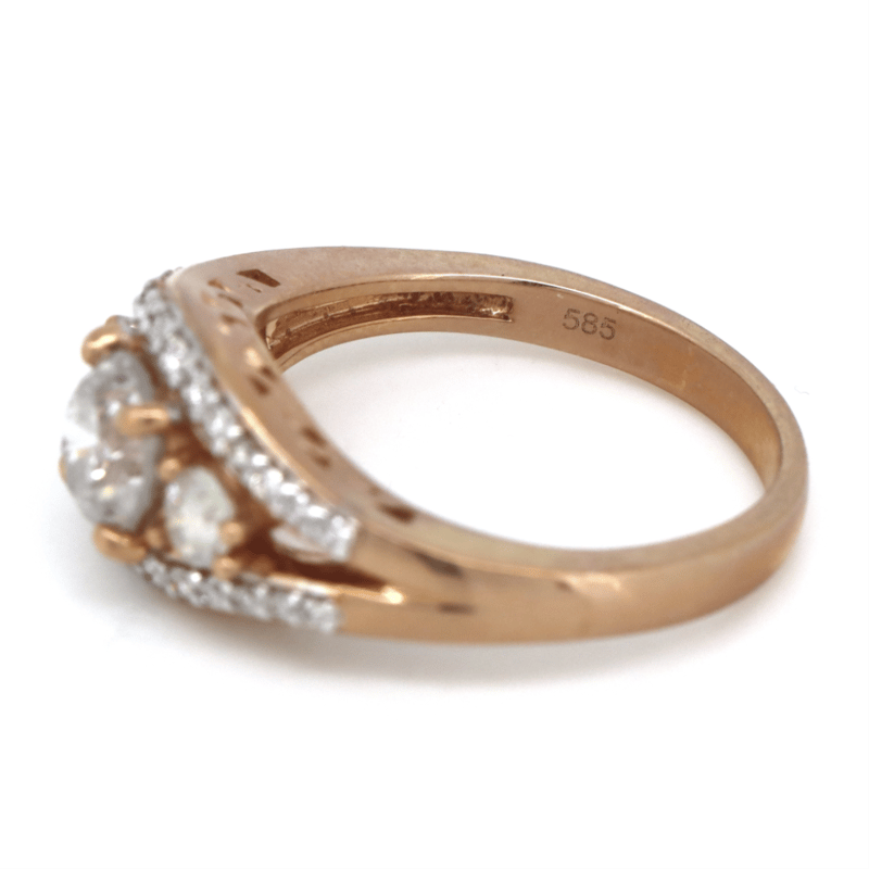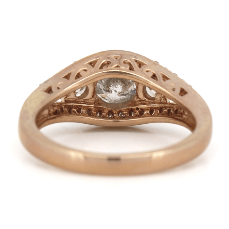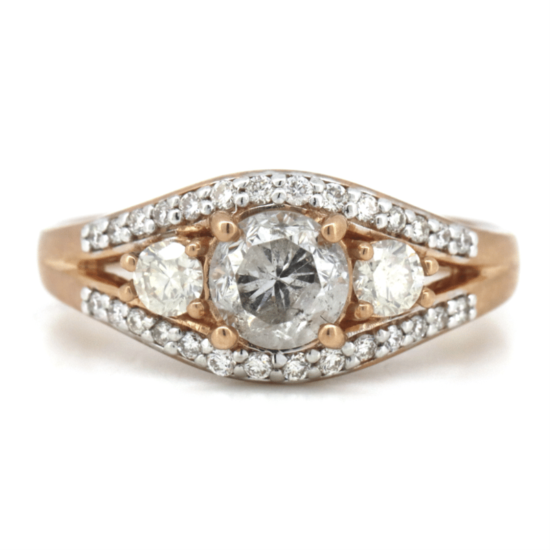 14K ROSE GOLD AND DIAMOND, TRILOGY RING. THE CENTRE FEATURES, ONE ROUND BRILLIANT CUT, DIAMOND (0.78CT, N COLOUR, I2 CLARITY), 4 CLAW SET. ACCOMPANIED BY, 2 ROUND BRILLIANT CUT, DIAMONDS (0.21CT TDW, M-N COLOUR, SI2-I1 CLARITY), CLAW SET. RING SIZE M. Valuations Provided by an Independent Third-Party Professional Not Directly Associated With Lloyds Auctions at AUD $$11,390.00This valuation has been conducted by an independent third-party professional. The valuation amount is an assessment by the issuing valuer and does not reflect the auction value of the item. Any inquiries regarding the valuation should be directed to the issuing valuer (refer to contact details on the certificate), as Lloyds Auctions has no affiliation or influence over the valuation, the valuer, or the stated amount. Condition: Good - Refer Images 0645858+1697