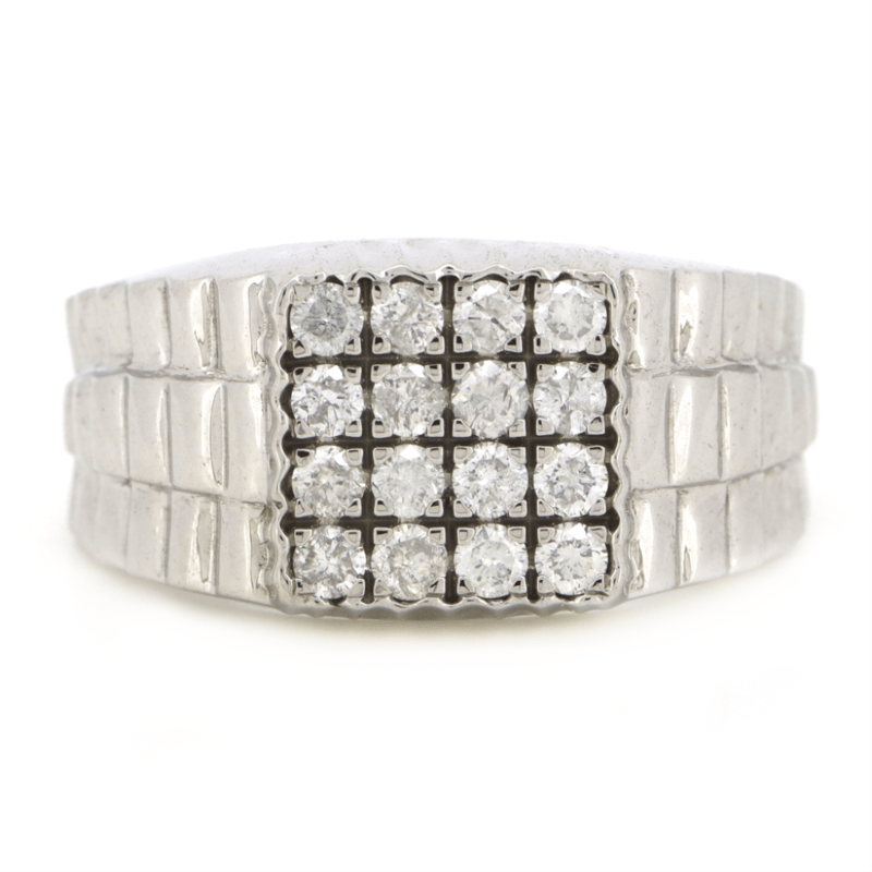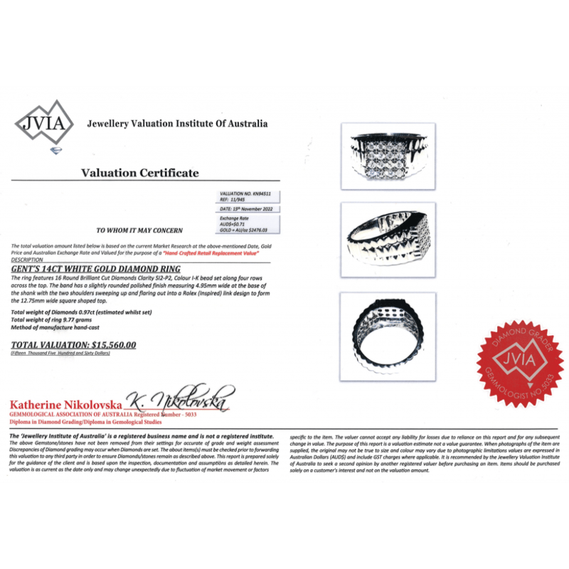 14K WHITE GOLD, 0.97CT TDW DIAMOND, GENTS RING. THE DESIGN FEATURES, 16 ROUND BRILLIANT CUT, DIAMONDS (0.97CT TDW, I-K COLOUR, SI2-P2 CLARITY), BEAD SET. RING SIZE X. Valuations Provided by an Independent Third-Party Professional Not Directly Associated With Lloyds Auctions at AUD $$15,560.00This valuation has been conducted by an independent third-party professional. The valuation amount is an assessment by the issuing valuer and does not reflect the auction value of the item. Any inquiries regarding the valuation should be directed to the issuing valuer (refer to contact details on the certificate), as Lloyds Auctions has no affiliation or influence over the valuation, the valuer, or the stated amount. Condition: Good - Refer Images 0645858+1650
