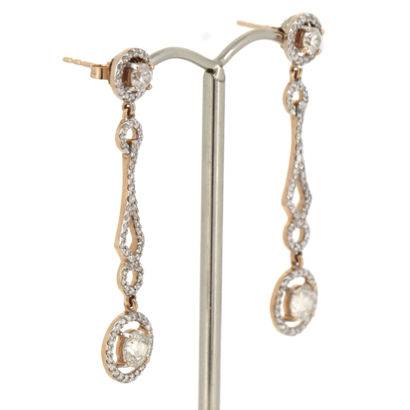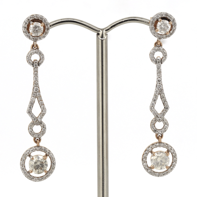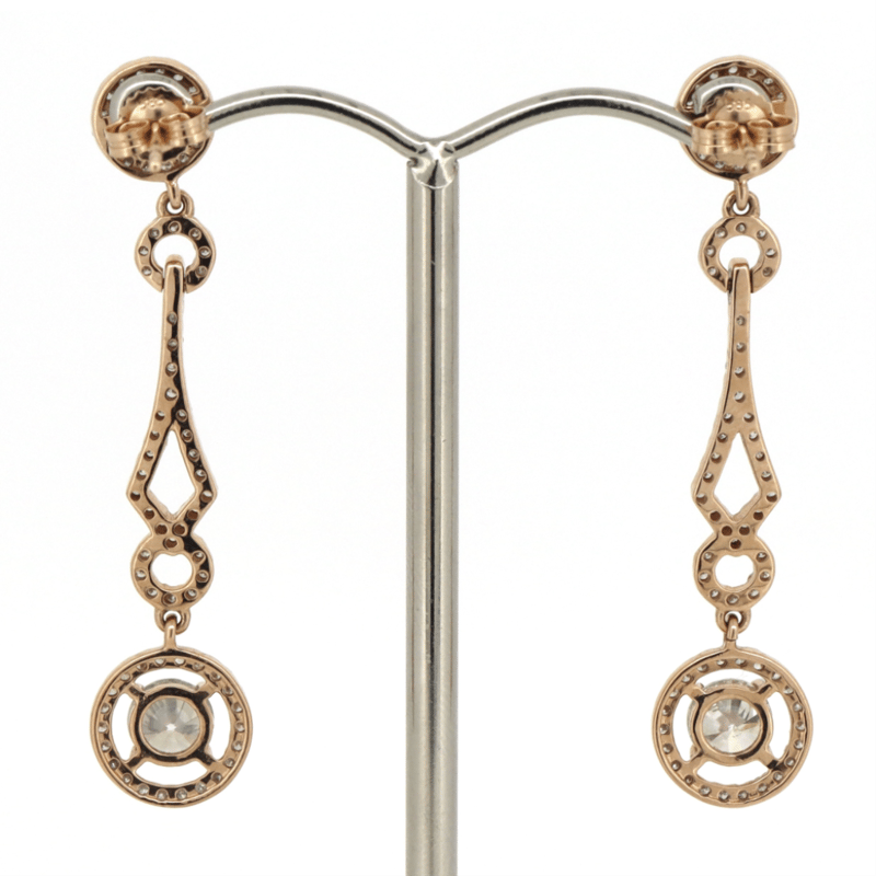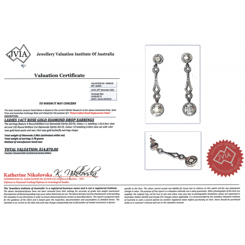 14K ROSE GOLD AND DIAMOND, ART DECO INSPIRED DROP EARRINGS. THE STUDS AND DROPS FEATURE, 4 ROUND BRILLIANT CUT, DIAMONDS (1.41CT TDW, J-L COLOUR, SI2-P2 CLARITY), CLAW SET. ENCOMPASSING THE LARGER STONES AND DECORATING THE SETTING ARE, 132 ROUND BRILLIANT CUT, DIAMONDS (0.65CT TDW, I-K COLOUR, SI2-P2 CLARITY), CLAW SET. THE EARRINGS HAVE POST BACKS WITH 14K ROSE GOLD BUTTERFLY CLASPS. Valuations Provided by an Independent Third-Party Professional Not Directly Associated With Lloyds Auctions at AUD $14870This valuation has been conducted by an independent third-party professional. The valuation amount is an assessment by the issuing valuer and does not reflect the auction value of the item. Any inquiries regarding the valuation should be directed to the issuing valuer (refer to contact details on the certificate), as Lloyds Auctions has no affiliation or influence over the valuation, the valuer, or the stated amount. Condition: Good - Refer Images 0645864+1302