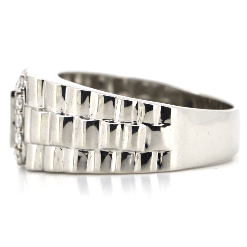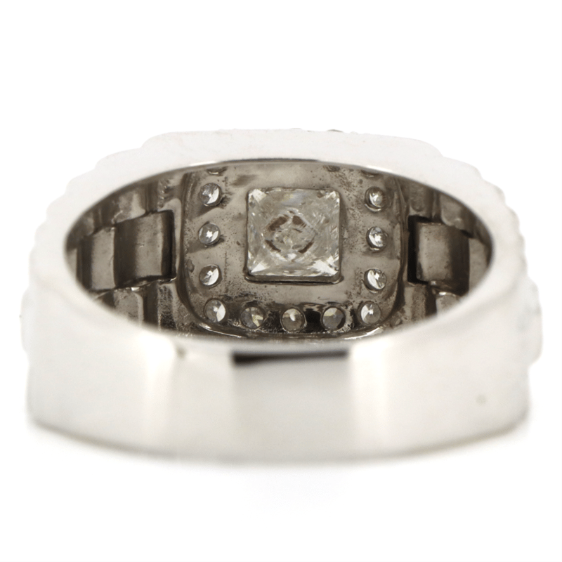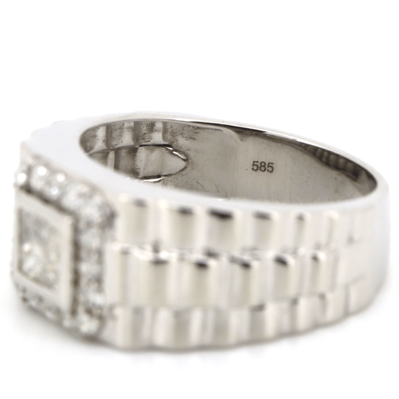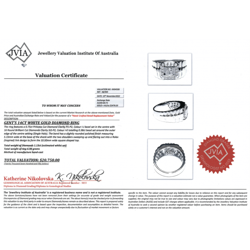 14K WHITE GOLD AND DIAMOND, GENTS RING. THE CENTRE FEATURES, ONE PRINCESS CUT, DIAMOND (0.75CT, I-J COLOUR, P1-P2 CLARITY), BEZEL SET. SURROUNDING THE CENTRE IN A HALO ARE, 16 ROUND BRILLIANT CUT, DIAMONDS (0.38CT TDW, I-K COLOUR, SI2-P2 CLARITY), BEAD SET. RING SIZE T 1/2. Valuations Provided by an Independent Third-Party Professional Not Directly Associated With Lloyds Auctions at AUD $20750This valuation has been conducted by an independent third-party professional. The valuation amount is an assessment by the issuing valuer and does not reflect the auction value of the item. Any inquiries regarding the valuation should be directed to the issuing valuer (refer to contact details on the certificate), as Lloyds Auctions has no affiliation or influence over the valuation, the valuer, or the stated amount. Condition: Good - Refer Images 0645864+1307