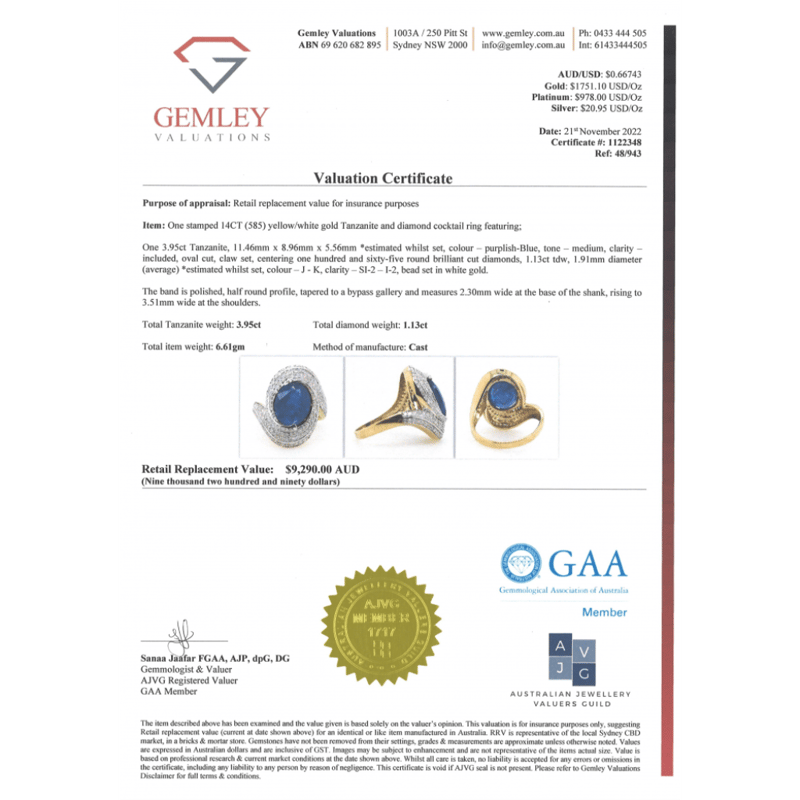 14K YELLOW/WHITE GOLD, TANZANITE AND DIAMOND, SWIRL CLUSTER RING. THE CENTRE FEATURES, ONE OVAL CUT, MEDIUM PURPLISH-BLUE, TANZANITE (3.95CT, INCLUDED), CLAW SET. SURROUNDING THE CENTRE IN A SWIRL ARE, 65 ROUND BRILLIANT CUT, DIAMONDS (1.13CT TDW, J-K COLOUR, SI2-I2 CLARITY), BEAD SET IN WHITE GOLD. RING SIZE P. Valuations Provided by an Independent Third-Party Professional Not Directly Associated With Lloyds Auctions at AUD $9290This valuation has been conducted by an independent third-party professional. The valuation amount is an assessment by the issuing valuer and does not reflect the auction value of the item. Any inquiries regarding the valuation should be directed to the issuing valuer (refer to contact details on the certificate), as Lloyds Auctions has no affiliation or influence over the valuation, the valuer, or the stated amount. Condition: Good - Refer Images 0645864+1354