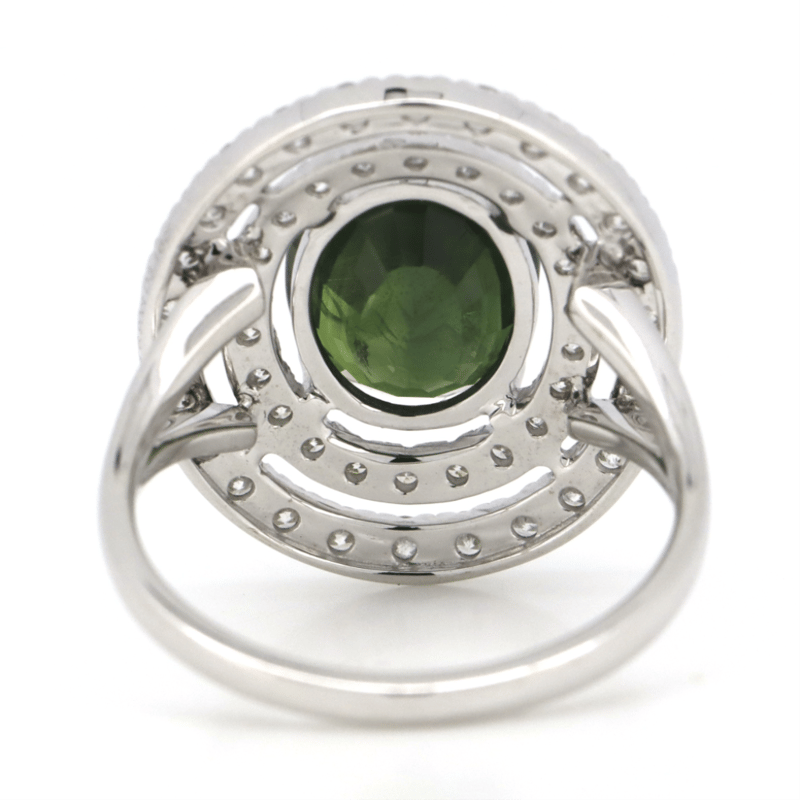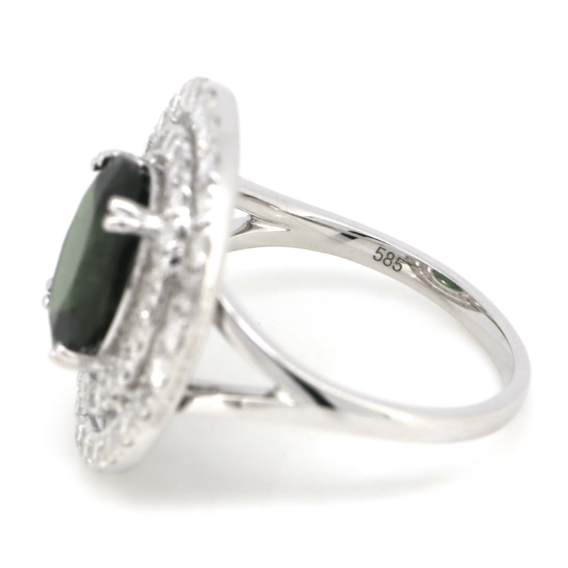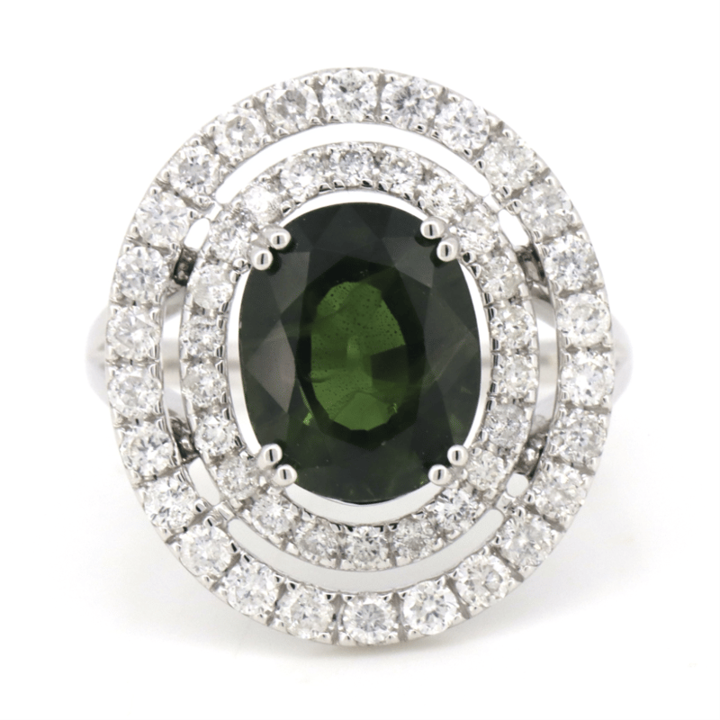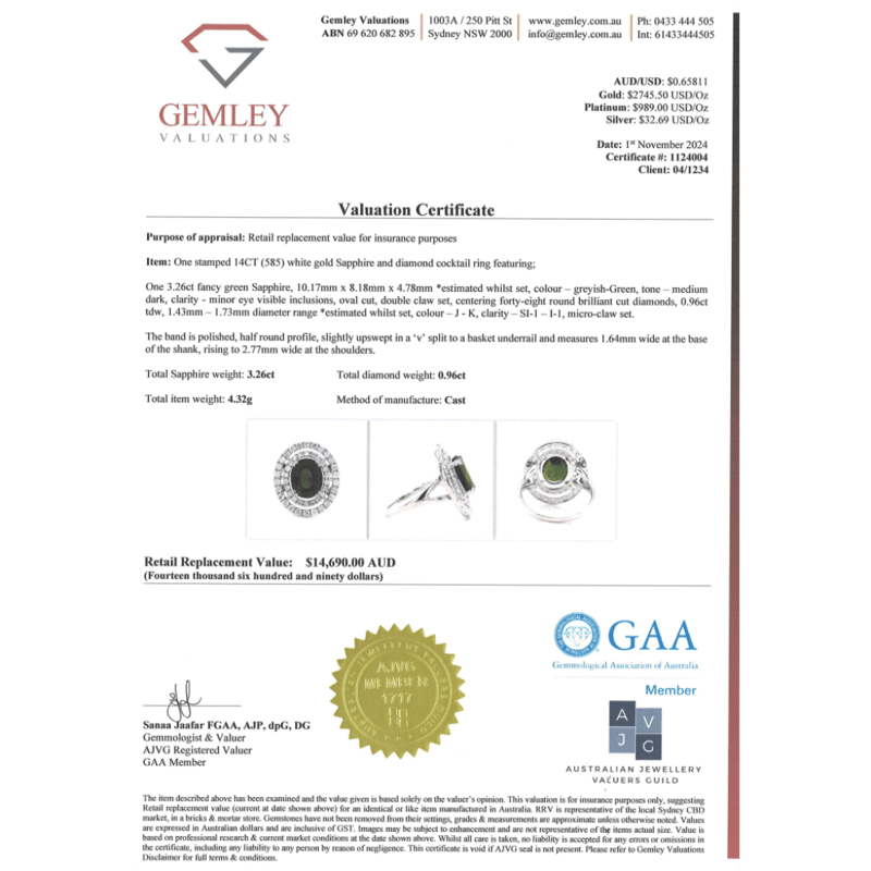 14K WHITE GOLD, GREEN SAPPHIRE AND DIAMOND, HALO RING. THE CENTRE FEATURES, ONE OVAL CUT, MEDIUM-DARK GREYISH-GREEN, SAPPHIRE (3.26CT, MINOR EYE VISIBLE INCLUSIONS), DOUBLE CLAW SET. SURROUNDING THE CENTRE IN A DOUBLE HALO ARE, 48 ROUND BRILLIANT CUT, DIAMONDS (0.96CT TDW, J-K COLOUR, SI1-I1 CLARITY), MICRO-CLAW SET. RING SIZE. N. Valuations Provided by an Independent Third-Party Professional Not Directly Associated With Lloyds Auctions at AUD $14690This valuation has been conducted by an independent third-party professional. The valuation amount is an assessment by the issuing valuer and does not reflect the auction value of the item. Any inquiries regarding the valuation should be directed to the issuing valuer (refer to contact details on the certificate), as Lloyds Auctions has no affiliation or influence over the valuation, the valuer, or the stated amount. Condition: Good - Refer Images 0645864+1341