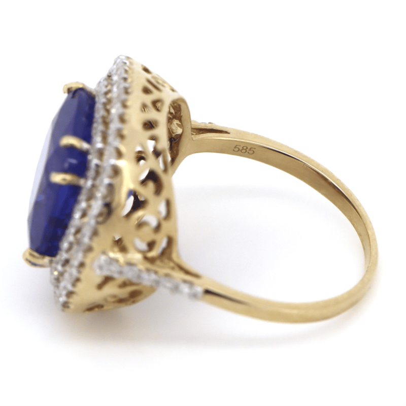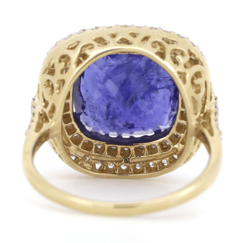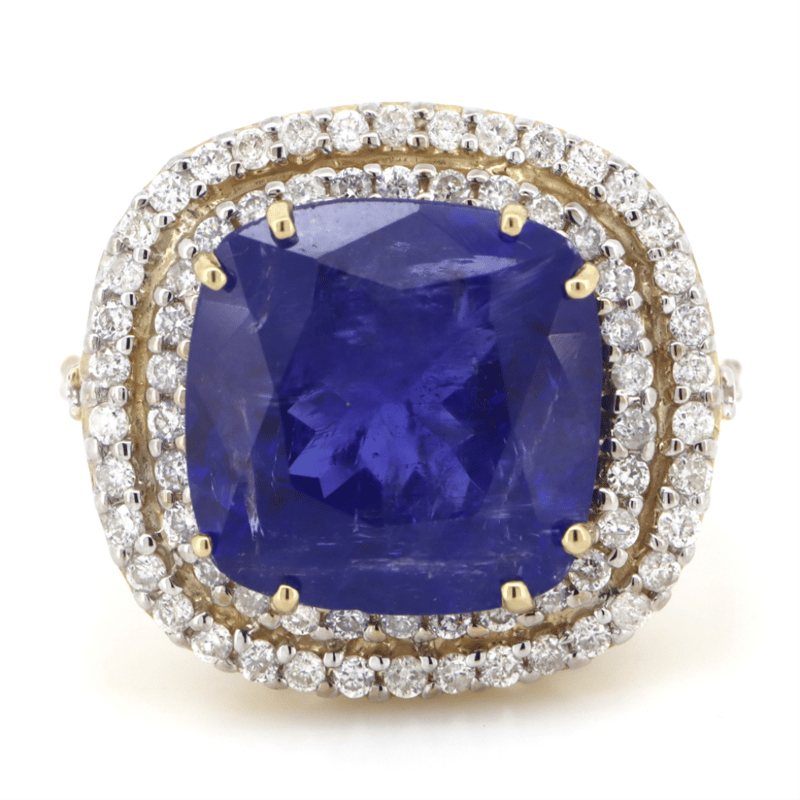 14K YELLOW GOLD, 7.24CT TANZANITE AND DIAMOND, COCKTAIL RING. THE CENTRE FEATURES, ONE SQUARE CUSHION FACETED CUT, DEEP PURPLISH-BLUE, TANZANITE (7.24CT TSW, INCLUDED), DOUBLE 4 CLAW SET. SURROUNDING THE CENTRE IN A DOUBLE HALO AND DECORATING THE SHOULDERS ARE, 78 ROUND BRILLIANT CUT, DIAMONDS (0.64CT TDW, I-K COLOUR, P1-P2 CLARITY), CLAW SET. RING SIZE O. Valuations Provided by an Independent Third-Party Professional Not Directly Associated With Lloyds Auctions at AUD $11750This valuation has been conducted by an independent third-party professional. The valuation amount is an assessment by the issuing valuer and does not reflect the auction value of the item. Any inquiries regarding the valuation should be directed to the issuing valuer (refer to contact details on the certificate), as Lloyds Auctions has no affiliation or influence over the valuation, the valuer, or the stated amount. Condition: Good - Refer Images 0645864+1345