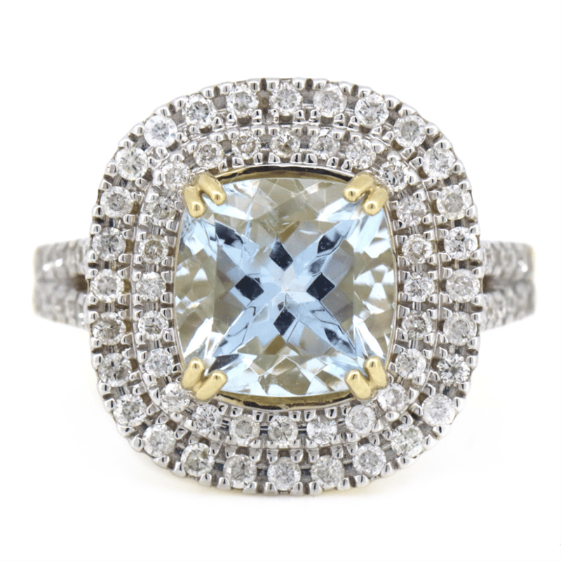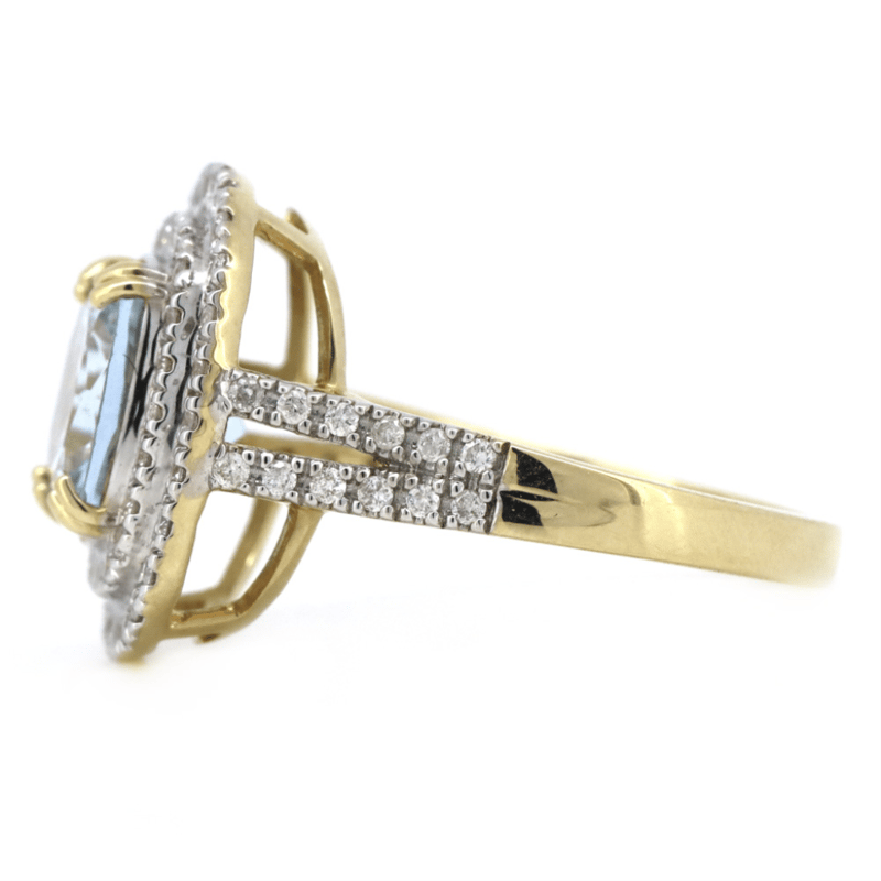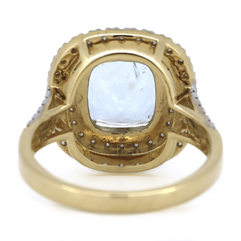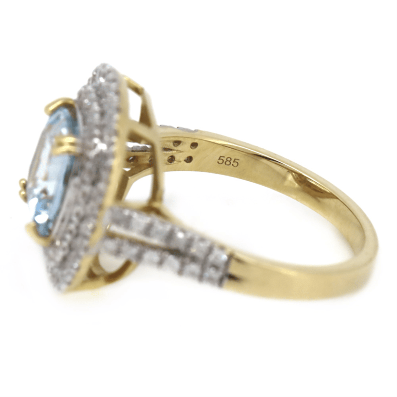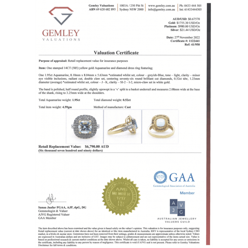 14K YELLOW GOLD, AQUAMARINE AND DIAMOND, DOUBLE HALO RING. THE CENTRE FEATURES, ONE RADIANT CUT, LIGHT GREYISH-BLUE, AQUAMARINE (1.95CT, MINOR EYE VISIBLE INCLUSIONS), DOUBLE CLAW SET. SURROUNDING THE CENTRE IN A DOUBLE HALO AND DECORATING THE BAND ARE, 76 ROUND BRILLIANT CUT, DIAMONDS (0.52CT TDW, J-K COLOUR, SI2-I2 CLARITY), MICRO-CLAW SET IN WHITE GOLD. RING SIZE M 1/2. Valuations Provided by an Independent Third-Party Professional Not Directly Associated With Lloyds Auctions at AUD $6790This valuation has been conducted by an independent third-party professional. The valuation amount is an assessment by the issuing valuer and does not reflect the auction value of the item. Any inquiries regarding the valuation should be directed to the issuing valuer (refer to contact details on the certificate), as Lloyds Auctions has no affiliation or influence over the valuation, the valuer, or the stated amount. Condition: Good - Refer Images 0645864+1336
