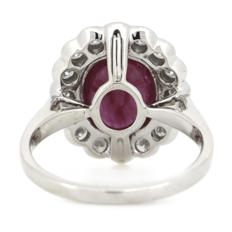 14K WHITE GOLD, RUBY AND DIAMOND, ANTIQUE INSPIRED RING. THE CENTRE FEATURES, ONE OVAL CUT, MEDIUM DARK PURPLISH-RED, RUBY (2.76CT INCLUDED), BEZEL SET. SURROUNDING THE STONE ARE, 16 ROUND BRILLIANT CUT, DIAMONDS (0.89CT TDW, J-K COLOUR, SI2-I2 CLARITY), SEMI-BEZEL/BEAD SET. RING SIZE P. Valuations Provided by an Independent Third-Party Professional Not Directly Associated With Lloyds Auctions at AUD $13590This valuation has been conducted by an independent third-party professional. The valuation amount is an assessment by the issuing valuer and does not reflect the auction value of the item. Any inquiries regarding the valuation should be directed to the issuing valuer (refer to contact details on the certificate), as Lloyds Auctions has no affiliation or influence over the valuation, the valuer, or the stated amount. Condition: Good - Refer Images 0645864+1356