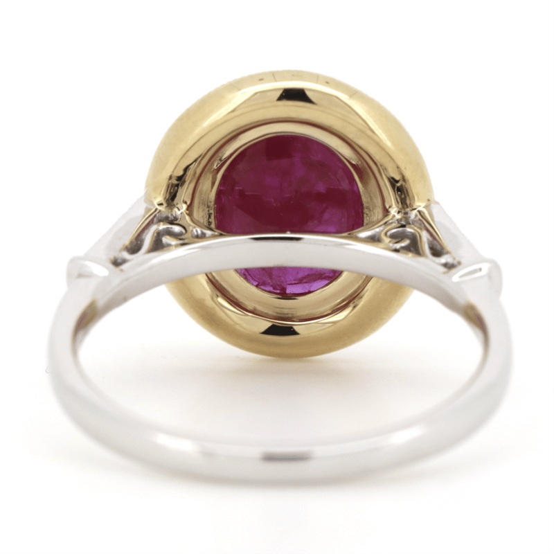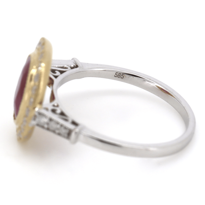 14K YELLOW/WHITE GOLD, RUBY AND DIAMOND, HALO RING. THE CENTRE FEATURES, ONE OVAL CUT, MEDIUM PURPLISH-PINK, RUBY (1.74CT, INCLUDED), BEZEL SET IN YELLOW GOLD WITH MILLEGRAIN DETAIL. SURROUNDING THE CENTRE IN A HALO AND DECORATING THE BAND ARE, 30 ROUND BRILLIANT CUT, DIAMONDS (0.37CT TDW, J-K COLOUR, SI2-I2 CLARITY), BEAD SET IN YELLOW/WHITE GOLD WITH MILLEGRAIN DETAIL. RING SIZE O 1/2. Valuations Provided by an Independent Third-Party Professional Not Directly Associated With Lloyds Auctions at AUD $9490This valuation has been conducted by an independent third-party professional. The valuation amount is an assessment by the issuing valuer and does not reflect the auction value of the item. Any inquiries regarding the valuation should be directed to the issuing valuer (refer to contact details on the certificate), as Lloyds Auctions has no affiliation or influence over the valuation, the valuer, or the stated amount. Condition: Good - Refer Images 0645864+1388
