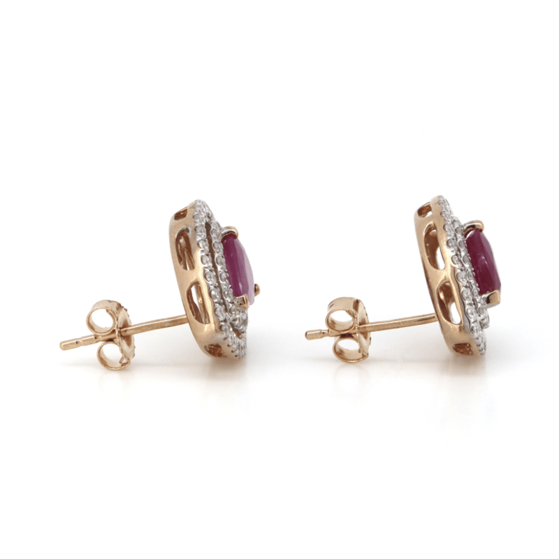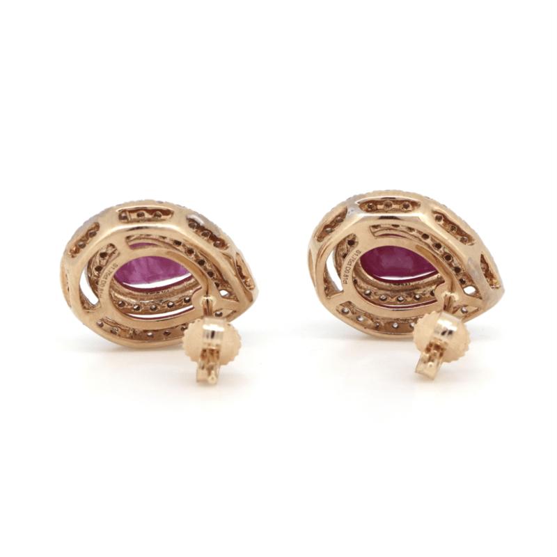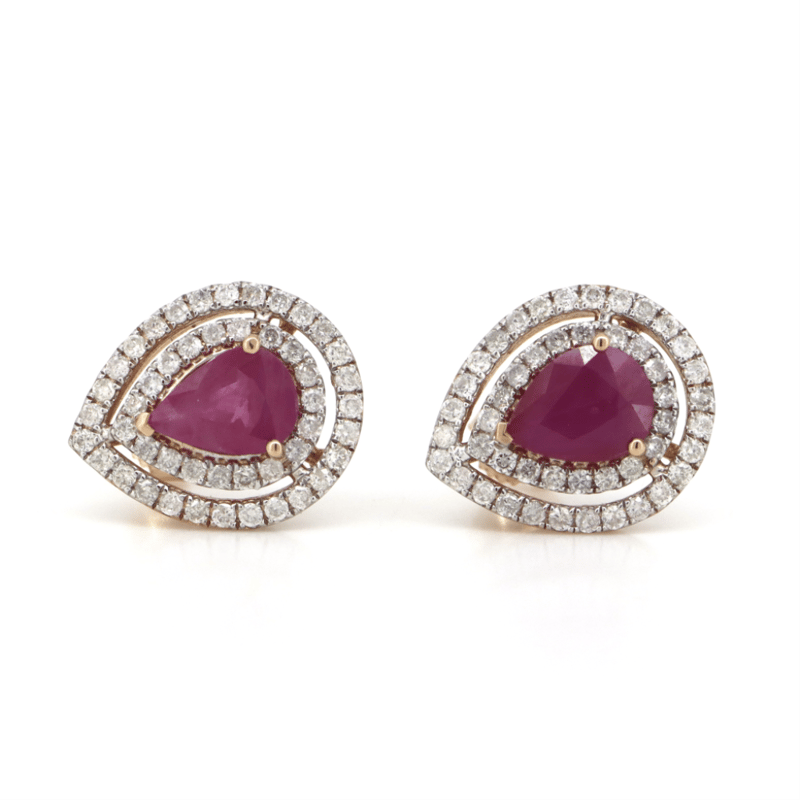 14K ROSE GOLD, RUBY AND DIAMOND, DOUBLE HALO STUD EARRINGS. THE CENTRES FEATURE, 2 PEAR CUT, MEDIUM PURPLISH-RED, RUBIES (1.75CT TSW, INCLUDED), 3 CLAW SET. SURROUNDING THE CENTRES IN DOUBLE HALOS ARE, 94 ROUND BRILLIANT CUT, DIAMONDS (0.81CT TDW, H-J COLOUR, SI2-I2 CLARITY), MICRO-CLAW SET IN WHITE GOLD. THE EARRINGS HAVE POST BACKS, WITH 14K ROSE GOLD BUTTERFLY CLASPS. Valuations Provided by an Independent Third-Party Professional Not Directly Associated With Lloyds Auctions at AUD $10390This valuation has been conducted by an independent third-party professional. The valuation amount is an assessment by the issuing valuer and does not reflect the auction value of the item. Any inquiries regarding the valuation should be directed to the issuing valuer (refer to contact details on the certificate), as Lloyds Auctions has no affiliation or influence over the valuation, the valuer, or the stated amount. Condition: Good - Refer Images 0645864+1397