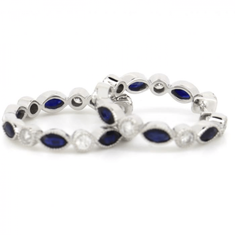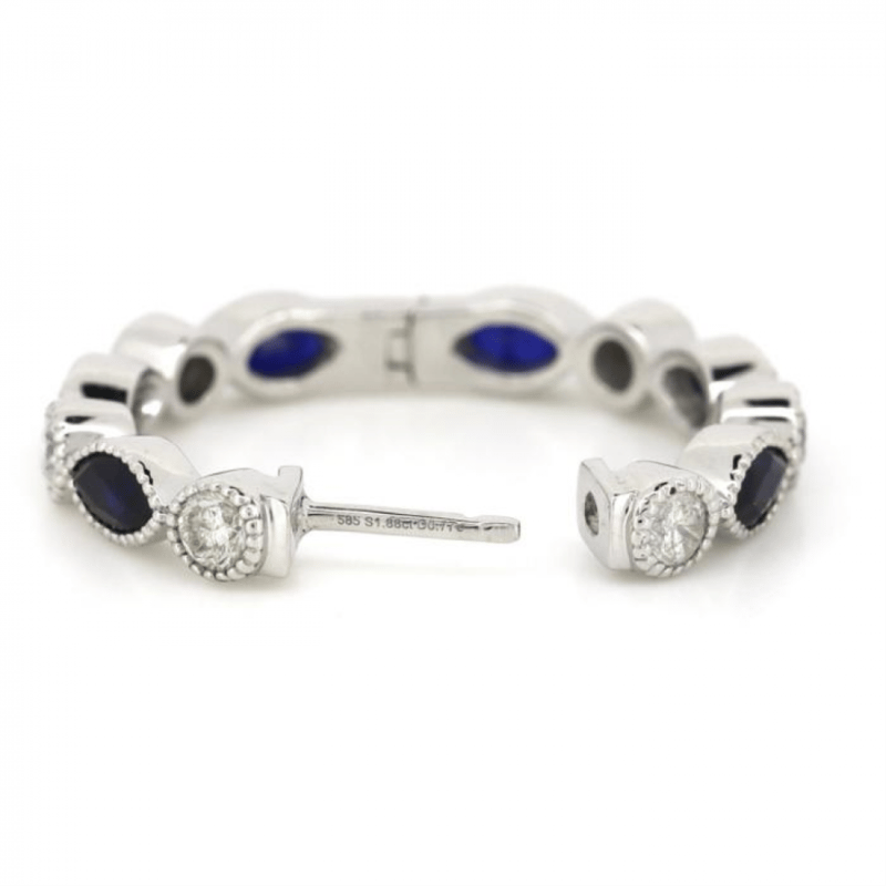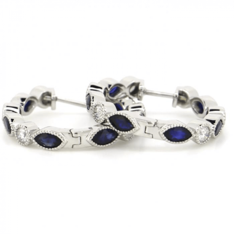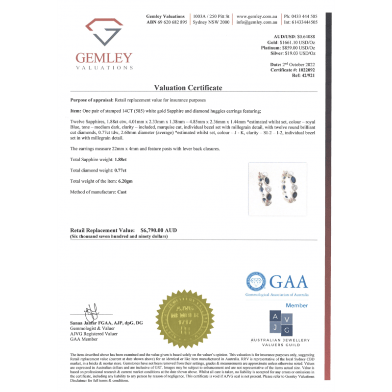 14K WHITE GOLD, BLUE SAPPHIRE AND DIAMOND, HOOP EARRINGS. THE HOOPS FEATURE, 12 MARQUISE CUT, ROYAL BLUE, SAPPHIRES (1.88CT TSW, INCLUDED), BEZEL SET WITH MILLEGRAIN DETAIL. ALTERNATING BETWEEN ARE, 12 ROUND BRILLIANT CUT, DIAMONDS (0.77CT TDW, J-K COLOUR, SI2-I2 CLARITY), BEZEL SET WITH MILLEGRAIN DETAIL. THE EARRINGS HAVE HINGED SNAP CLOSURES. Valuations Provided by an Independent Third-Party Professional Not Directly Associated With Lloyds Auctions at AUD $6790This valuation has been conducted by an independent third-party professional. The valuation amount is an assessment by the issuing valuer and does not reflect the auction value of the item. Any inquiries regarding the valuation should be directed to the issuing valuer (refer to contact details on the certificate), as Lloyds Auctions has no affiliation or influence over the valuation, the valuer, or the stated amount. Condition: Good - Refer Images 0645864+1303