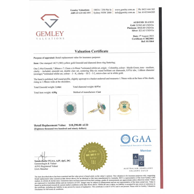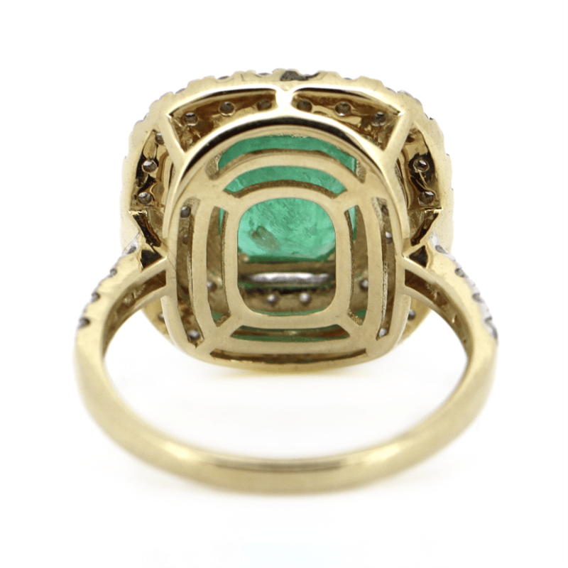 14K YELLOW/WHITE GOLD, 2.44CT COLOMBIAN EMERALD AND DIAMOND, DOUBLE HALO RING. THE CENTRE FEATURES, ONE EMERALD CUT, BLUISH-GREEN, COLOMBIAN EMERALD (2.44CT, INCLUDED), DOUBLE 4 CLAW SET. SURROUNDING THE CENTRE IN A DOUBLE HALO AND DECORATING THE BAND ARE, 56 ROUND BRILLIANT CUT, DIAMONDS (0.97CT TDW, J-K COLOUR, SI2-I2 CLARITY), CLAW SET IN WHITE GOLD. RING SIZE M. Valuations Provided by an Independent Third-Party Professional Not Directly Associated With Lloyds Auctions at AUD $18290This valuation has been conducted by an independent third-party professional. The valuation amount is an assessment by the issuing valuer and does not reflect the auction value of the item. Any inquiries regarding the valuation should be directed to the issuing valuer (refer to contact details on the certificate), as Lloyds Auctions has no affiliation or influence over the valuation, the valuer, or the stated amount. Condition: Good - Refer Images 0645871+1449