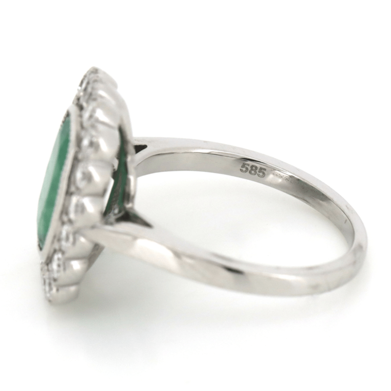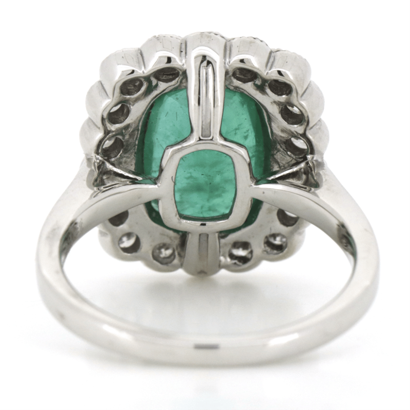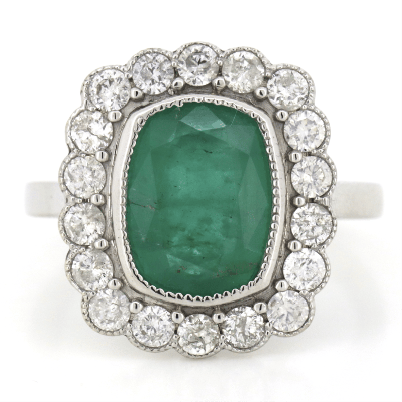 14K WHITE GOLD, EMERALD AND DIAMOND, HALO RING. THE CENTRE FEATURES, ONE RECTANGULAR CUSHION CUT, MEDIUM GREEN, EMERALD (2.78CT, INCLUDED), BEZEL SET. SURROUNDING THE CENTRE ARE, 18 ROUND BRILLIANT CUT, DIAMONDS (0.99CT TDW, J-L COLOUR, SI2-P2 CLARITY), BEZEL/BEAD SET. RING SIZE O. Valuations Provided by an Independent Third-Party Professional Not Directly Associated With Lloyds Auctions at AUD $18260This valuation has been conducted by an independent third-party professional. The valuation amount is an assessment by the issuing valuer and does not reflect the auction value of the item. Any inquiries regarding the valuation should be directed to the issuing valuer (refer to contact details on the certificate), as Lloyds Auctions has no affiliation or influence over the valuation, the valuer, or the stated amount. Condition: Good - Refer Images 0645871+1431