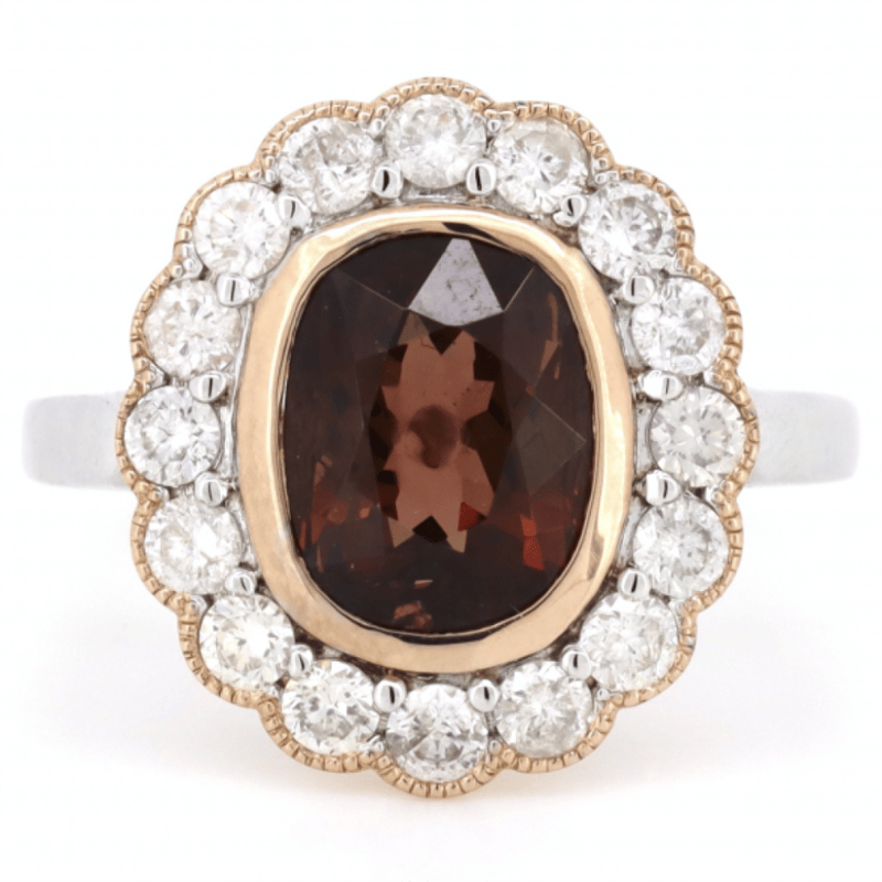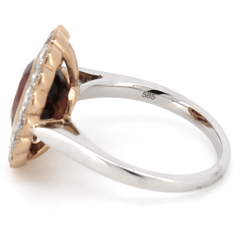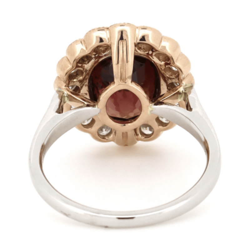 14K WHITE/ROSE GOLD, PINK TOURMALINE AND DIAMOND, HALO RING. THE CENTRE FEATURES, ONE OVAL CUT, MEDIUM REDDISH-PINK, TOURMALINE (3.15CT, MINOR EYE VISIBLE INCLUSIONS), BEZEL SET. SURROUNDING THE CENTRE IN A SCALLOPED HALO ARE, 16 ROUND BRILLIANT CUT, DIAMONDS (0.90CT TDW, J-K COLOUR, SI2-I2 CLARITY), SEMI-BEZEL/BEAD SET WITH MILLEGRAIN DETAIL. RING SIZE N 1/2. Valuations Provided by an Independent Third-Party Professional Not Directly Associated With Lloyds Auctions at AUD $9190This valuation has been conducted by an independent third-party professional. The valuation amount is an assessment by the issuing valuer and does not reflect the auction value of the item. Any inquiries regarding the valuation should be directed to the issuing valuer (refer to contact details on the certificate), as Lloyds Auctions has no affiliation or influence over the valuation, the valuer, or the stated amount. Condition: Good - Refer Images 0645871+1432